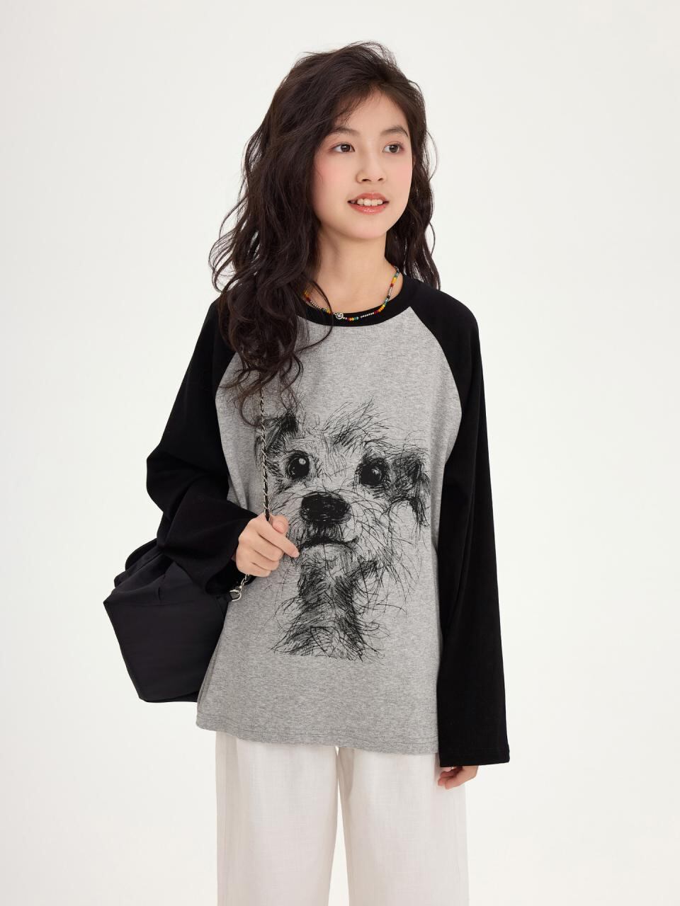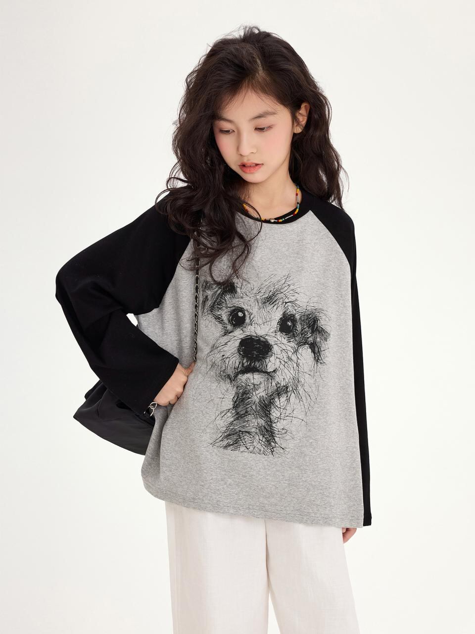 Tシャツ ガールズ 子供服 犬プリント 長袖 ゆったり トップス 春物 かわいい 韓国風 ミディアム丈 普段着 通学 灰色