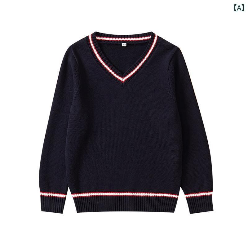 子供服 ニット・セーター 男女兼用 Vネック 長袖 コットン スクールセーター ストライプ 切り替え 春秋 100cm 110cm 120cm 130cm 140cm 150cm 160cm 170cm 180cm 紺色 グレー