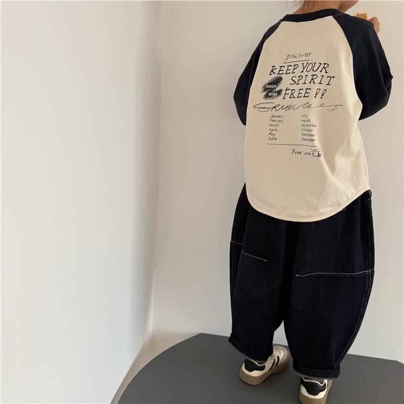 子供服 Tシャツ 男女兼用 長袖 トップス 春秋 子供 レトロ風 アルファベット プリント 切り替え 綿100% 吸湿速乾 普段使い
