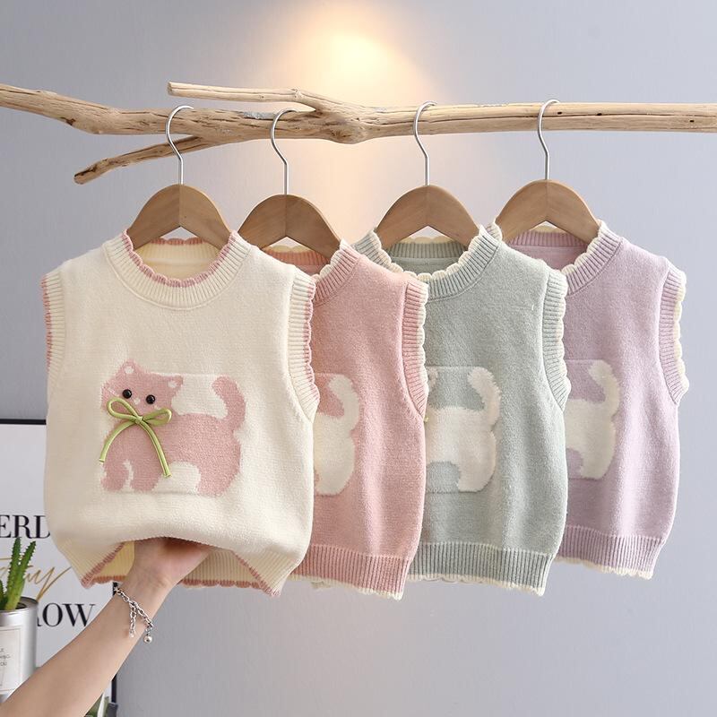ニット ベビー キッズ 女の子 ベスト 春秋 冬 韓国風 子供服 かわいい 猫柄 配色 90cm 100cm 110cm 120cm 130cm