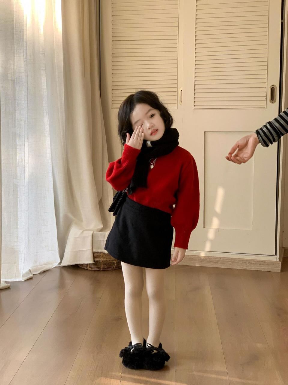子供服 ニット・セーター 女の子 冬服 ニット トップス ランタンスリーブ 丸首 プルオーバー かわいい おしゃれ ガーリー レトロ 韓国風 綿80% 90cm 100cm 110cm 120cm 130cm 140cm 赤 黒