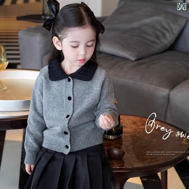 キッズ ニット カーディガン 秋冬 女の子 韓国風 子供服 配色 襟付き トップス かわいい 綿 通園 通学 普段着 長袖 80 90 100 110 120 130 140 グレー