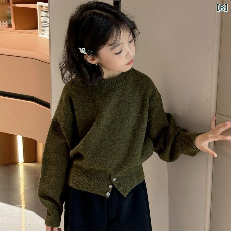 ニット・セーター ガールズ 子供服 冬物 トップス ニット 長袖 防寒 暖か 丸首 かわいい おしゃれ 普段着 通学 伸縮性 柔らかい グレー オリーブ色 パンツ
