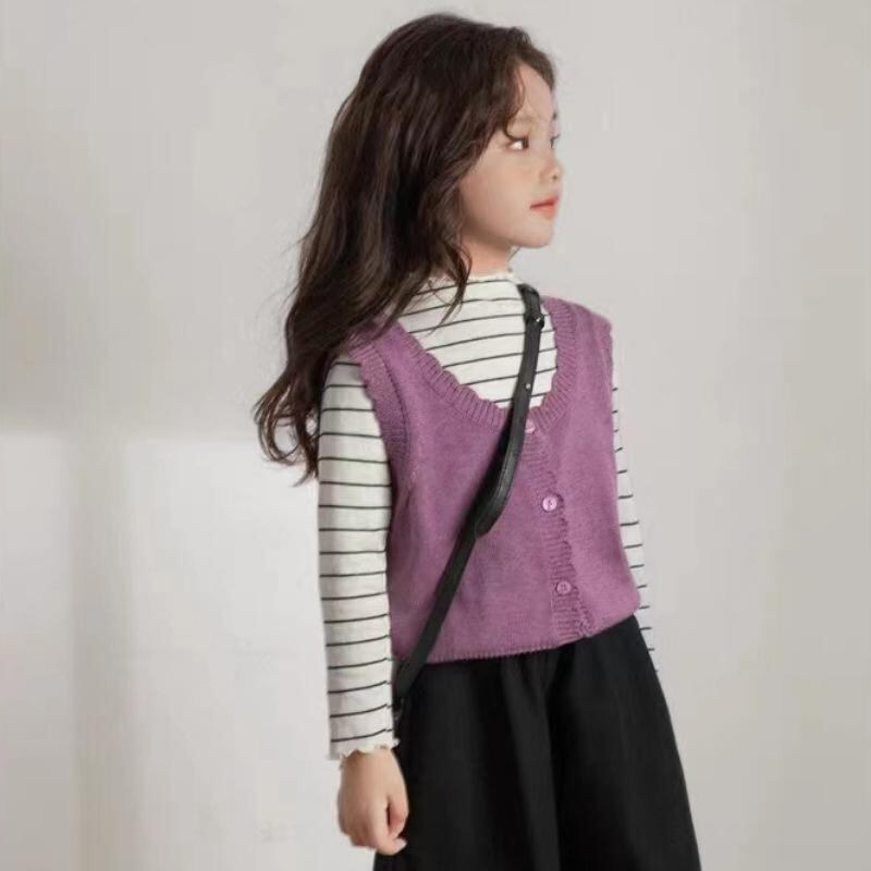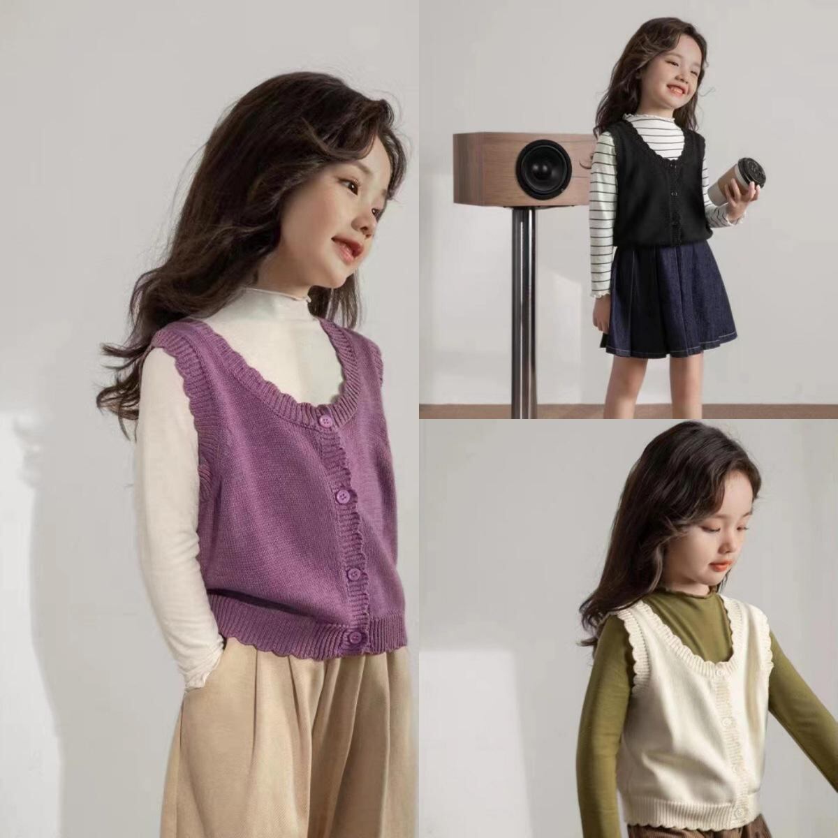 子供服 ニット ベスト 女の子 カーディガン 親子 ペア トップス 無地 丸首 コットン 柔らかい かわいい ガールズ キッズ パープル ブラック ベージュ 100 110 120 130 140 150 160 春秋
