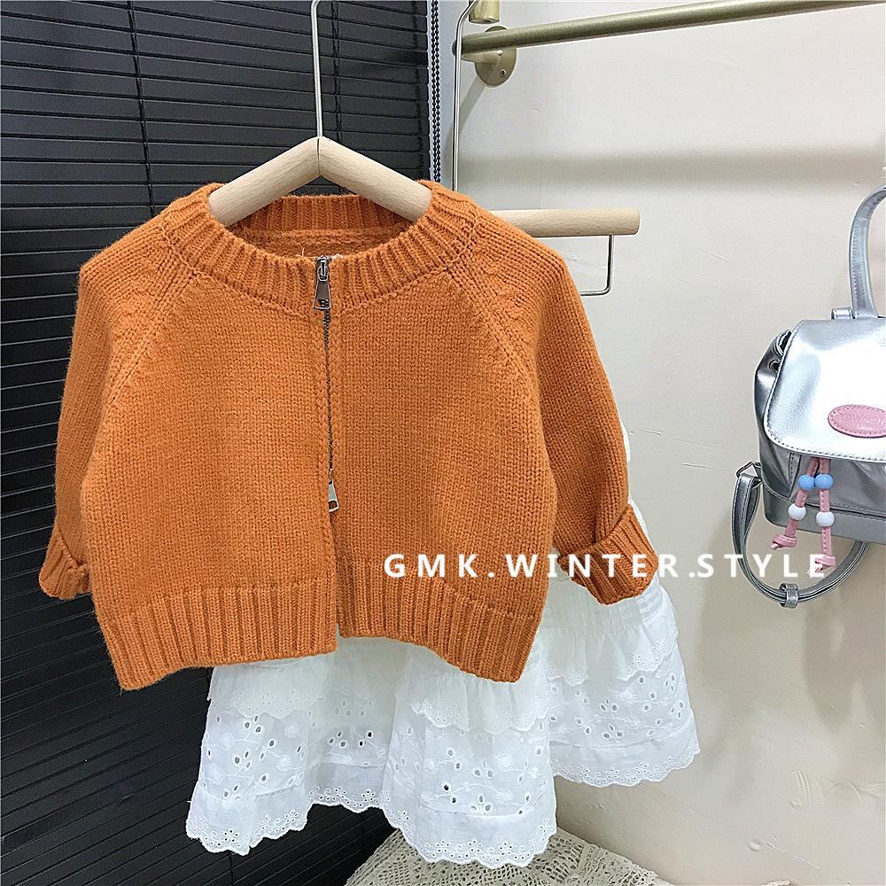 ニット カーディガン キッズ 女の子 韓国風 オレンジ系 ショート丈 ジップアップ ニットカーディガン 子供服 トップス 春秋 ゆったり かわいい 普段使い