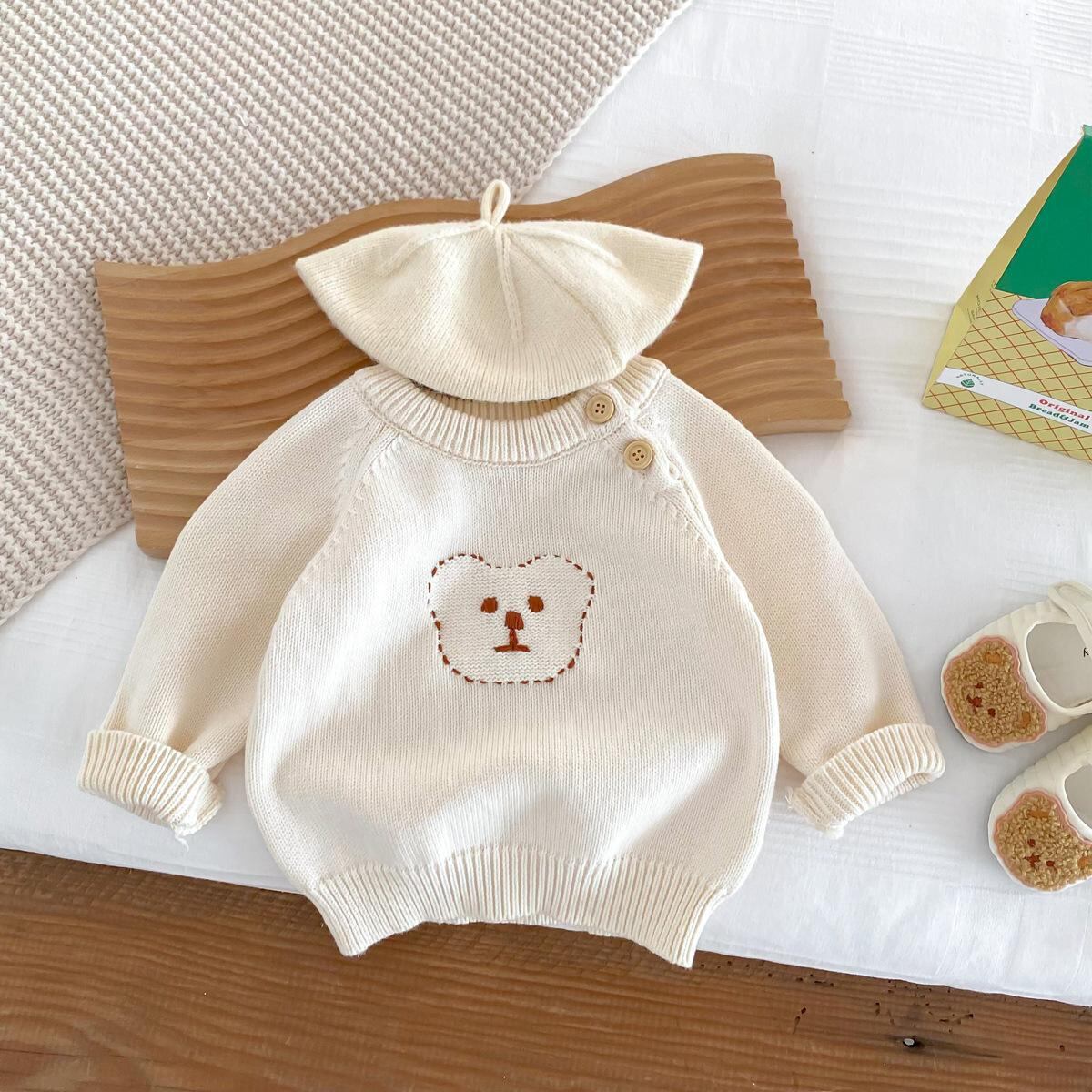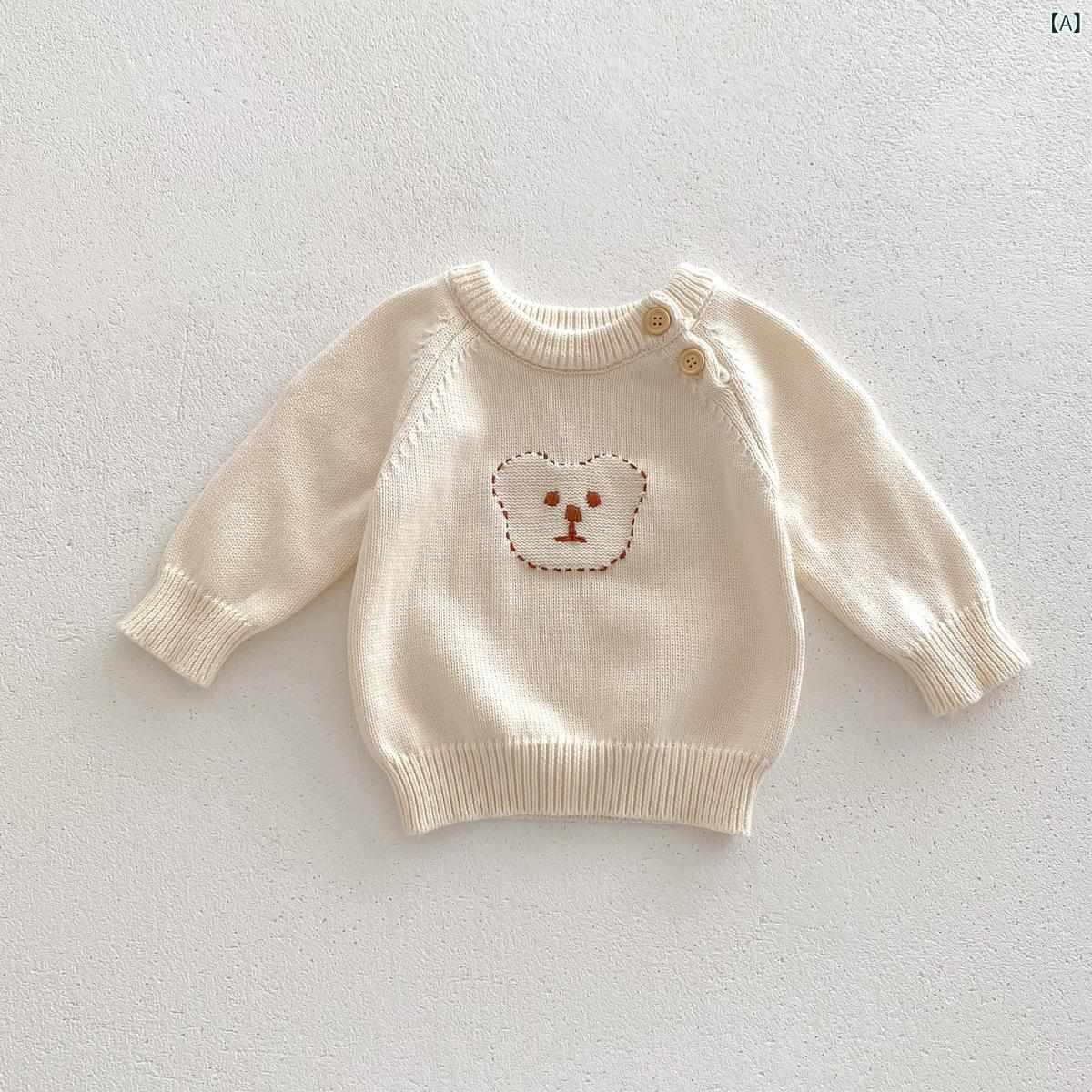 ベビー服 長袖ニット 小熊柄 肩ボタン付き 丸首 コットン100% 保温 秋冬 かわいい 普段使い