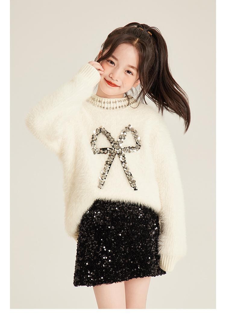 子供服 ニット セーター 女の子 トップス 秋冬 長袖 丸首 コットン 蝶結び スパンコール 普段着 通学 幼稚園 保育園 かわいい
