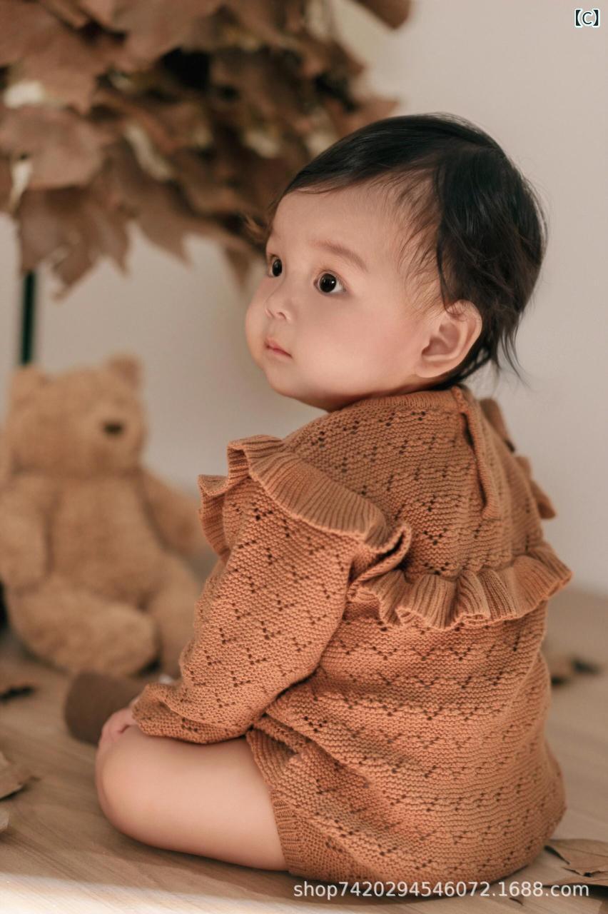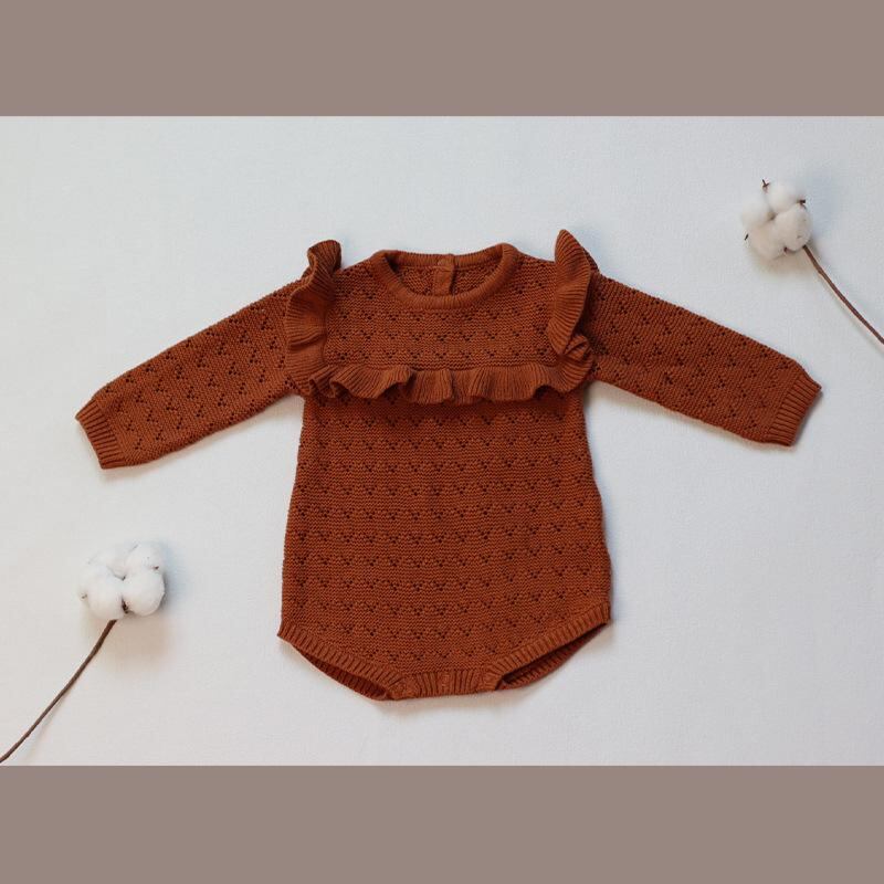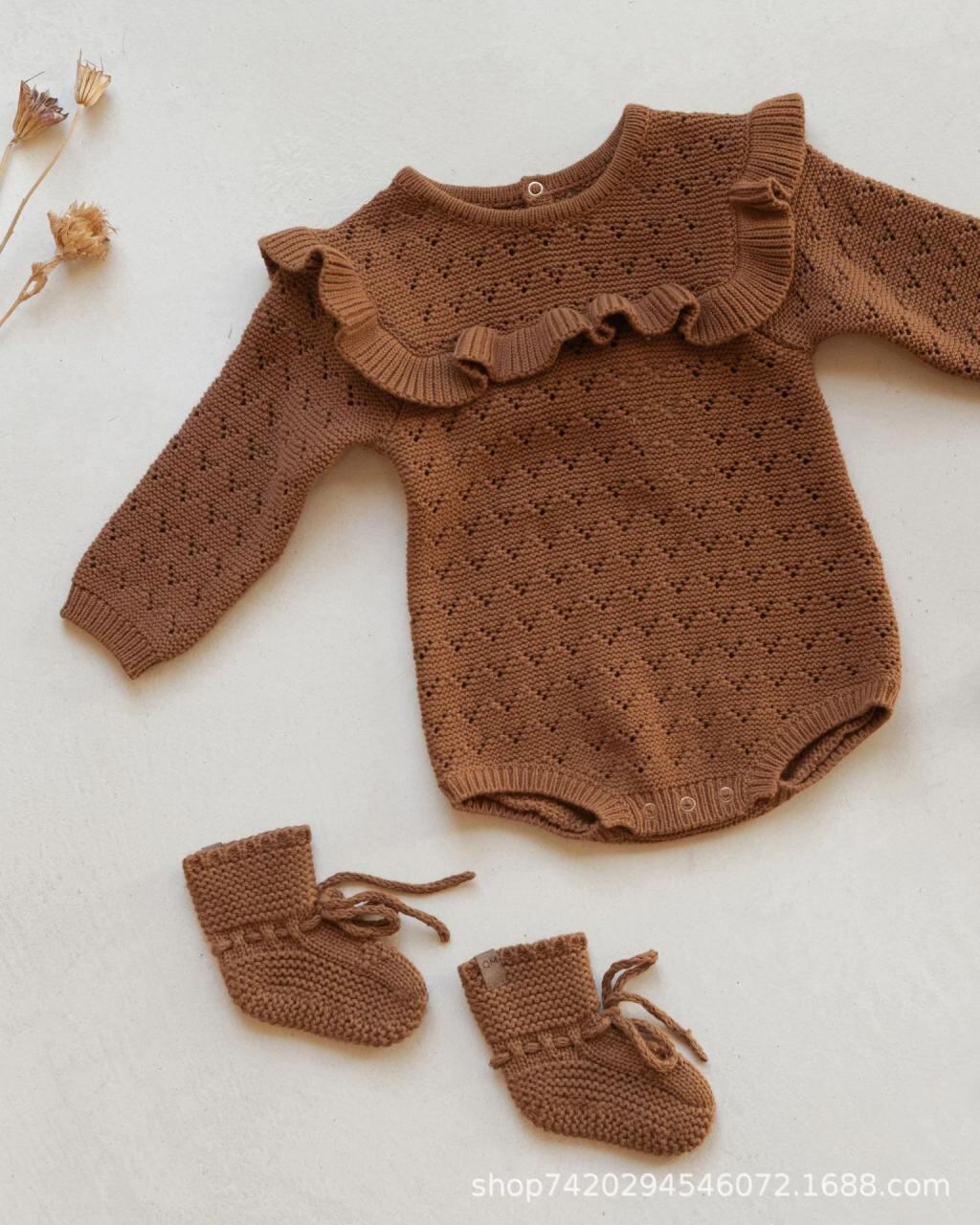 ベビー服 女の子 ニット ロンパース 春秋 長袖 綿100% 幼児 ケーブル編み ジャンプスーツ 襟フリル かわいい 普段使い