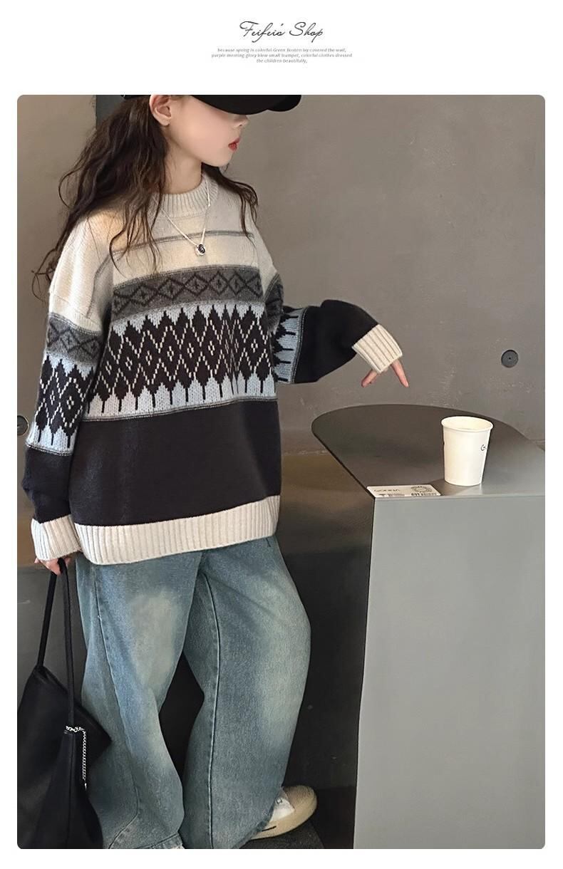 ニット・セーター ガールズ 子供服 秋冬 厚手 リブニット プルオーバー トップス ラウンドネック 菱形 長袖 普段着 かわいい おしゃれ 防寒 通学 120cm 130cm 140cm 150cm 160cm 170cm
