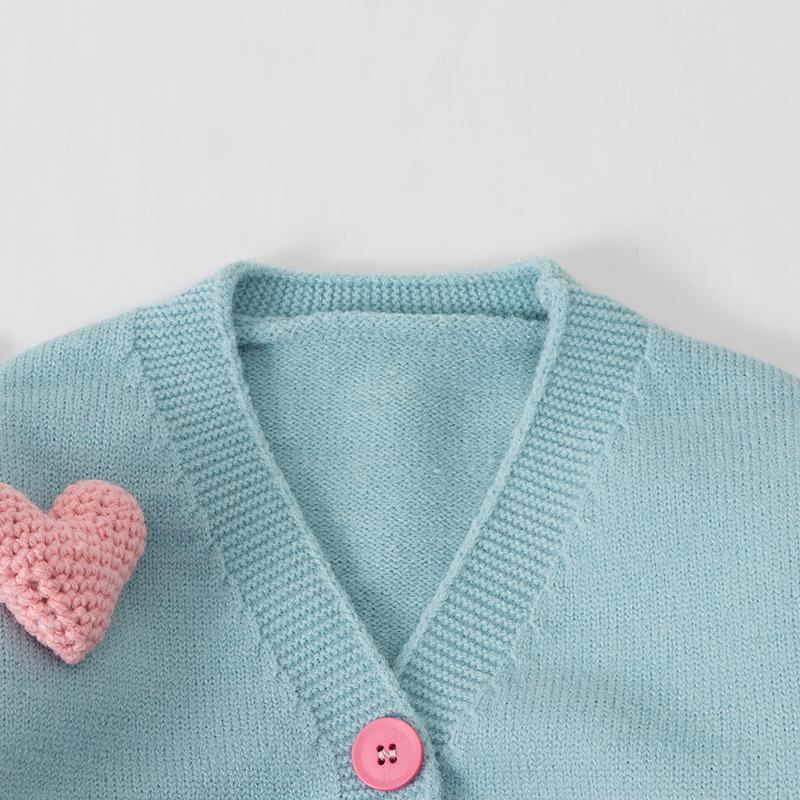 ニットカーディガン キッズ 女の子 子供服 春秋 Vネック 湖ブルー 立体ハート 無地 普段着