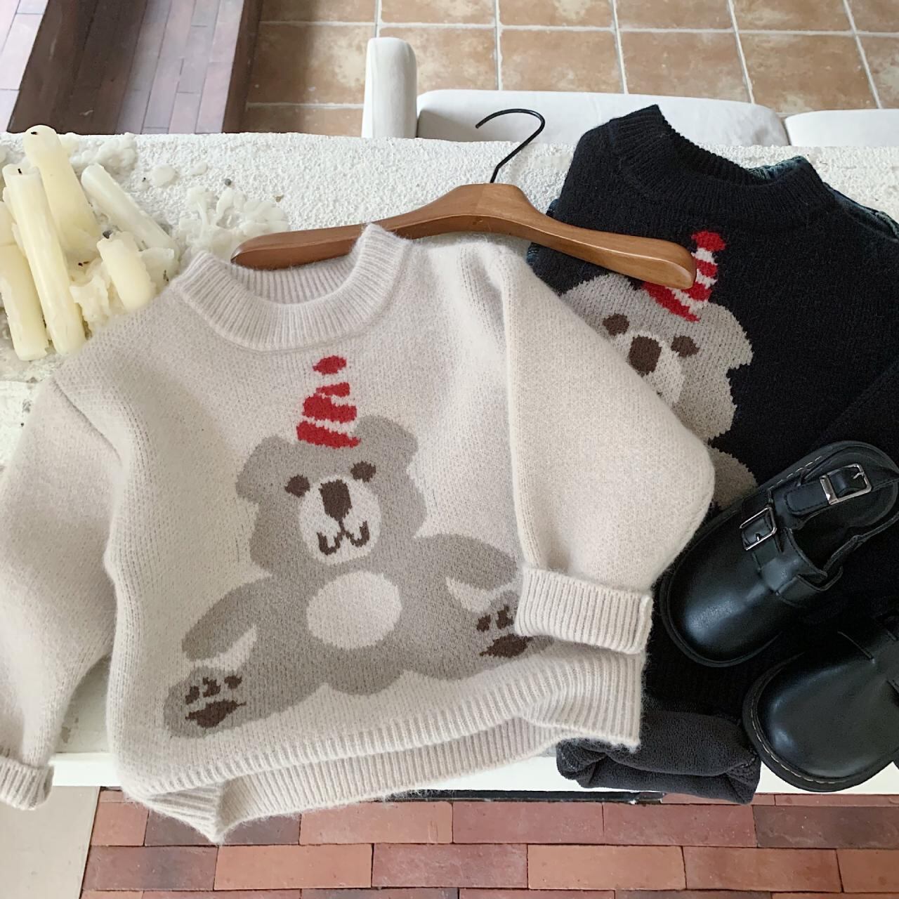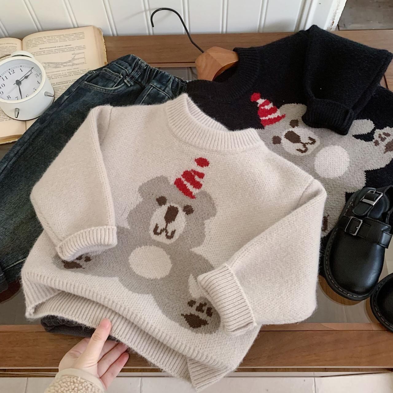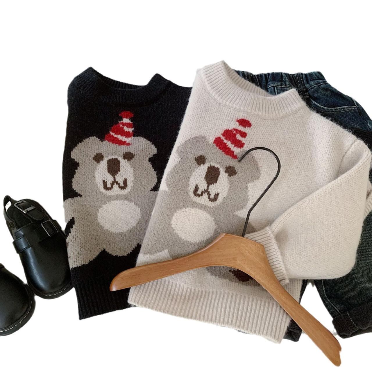 子供服 セーター ニット 小熊 クマ 厚手 男の子 女の子 長袖 トップス 秋冬 かわいい 普段使い 通園 通学 90 100 110 120 130 140 ブラック グレー