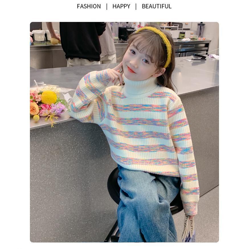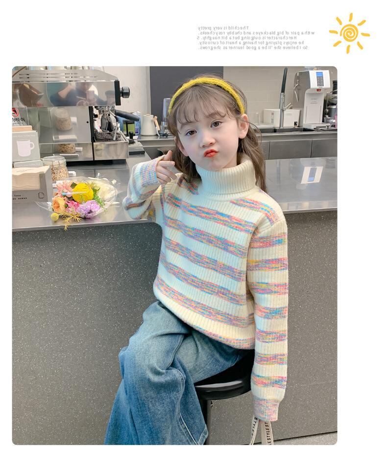 子供服 ニット セーター 秋冬 高 襟 長袖 ストライプ 厚手 裏起毛 女の子 ガールズ トップス 普段使い かわいい