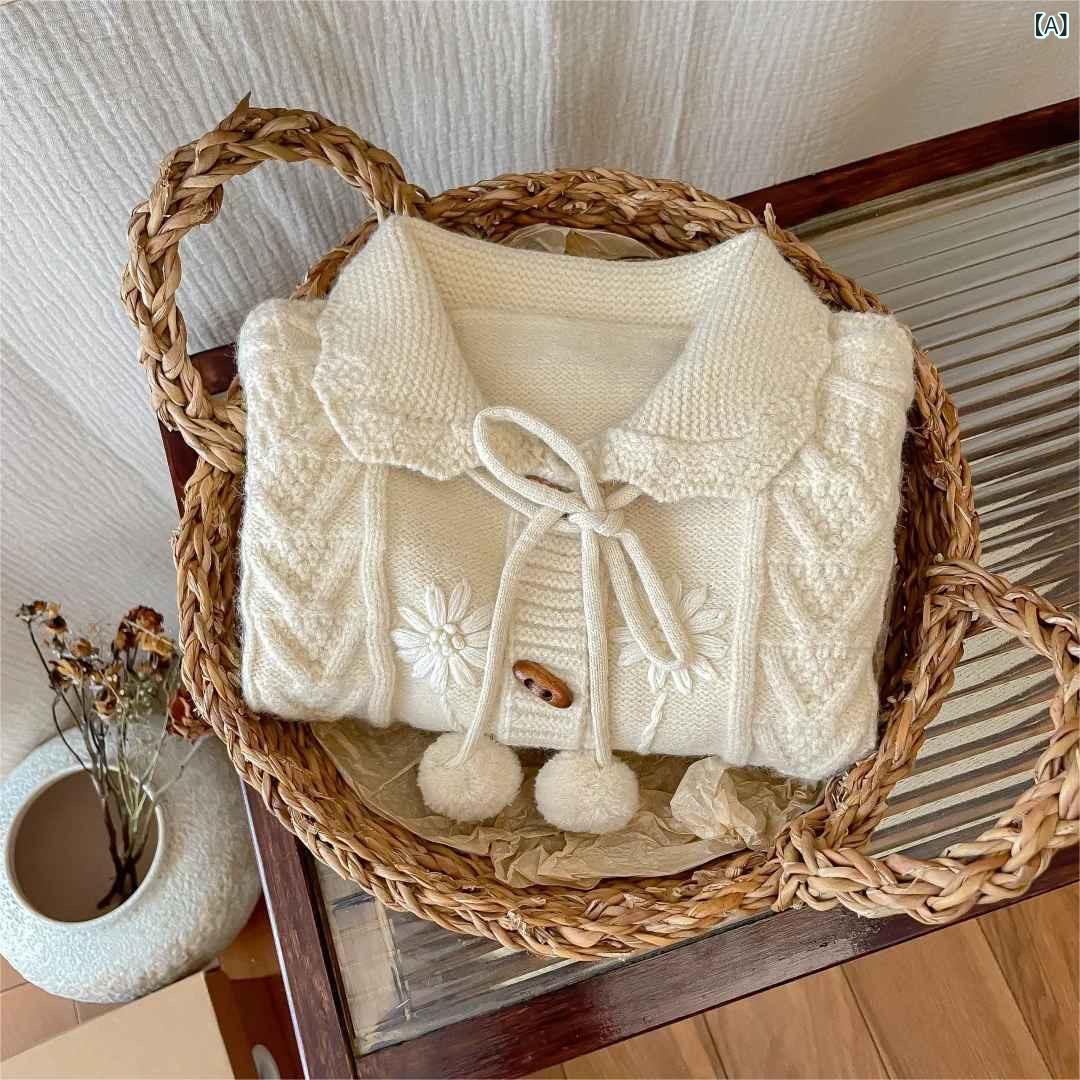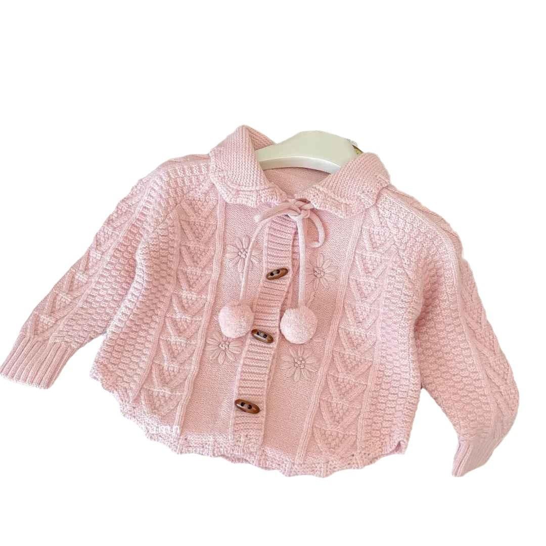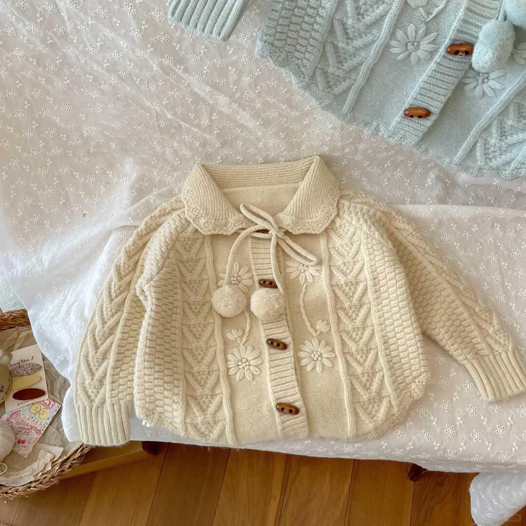子供服 ニット 女の子 カーディガン 秋冬 ニットカーディガン 丸首 長袖 レトロ 森ガール かわいい 立体 鉤針編み ボール ニットソー アウター オフホワイト 水色 ピンク系 80 90 100 110 120 130 140