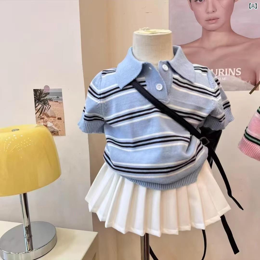 子供用ニットシャツ 半袖 春夏 女児 ポロシャツ ストライプ柄 薄手 女の子 普段使い 通園 通学 90 100 110 120 130 ブルー ピンク系