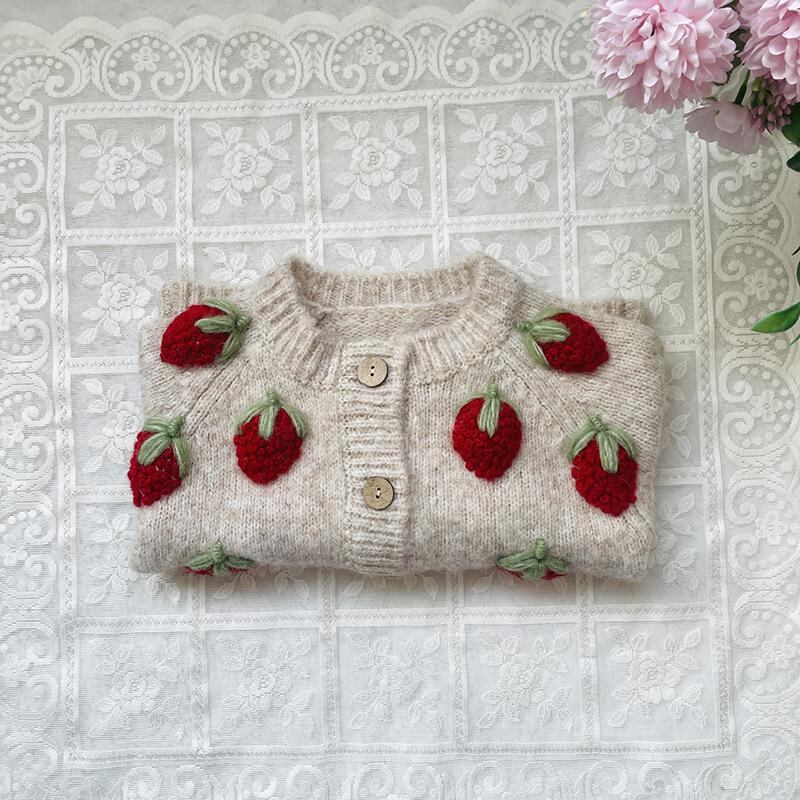 ニットカーディガン 女の子 ベビー キッズ 手編み風 草花柄 イチゴ柄 ウール混 秋冬 かわいい 暖か 白 オフホワイト