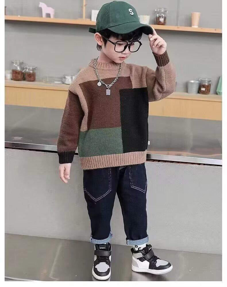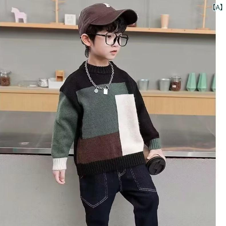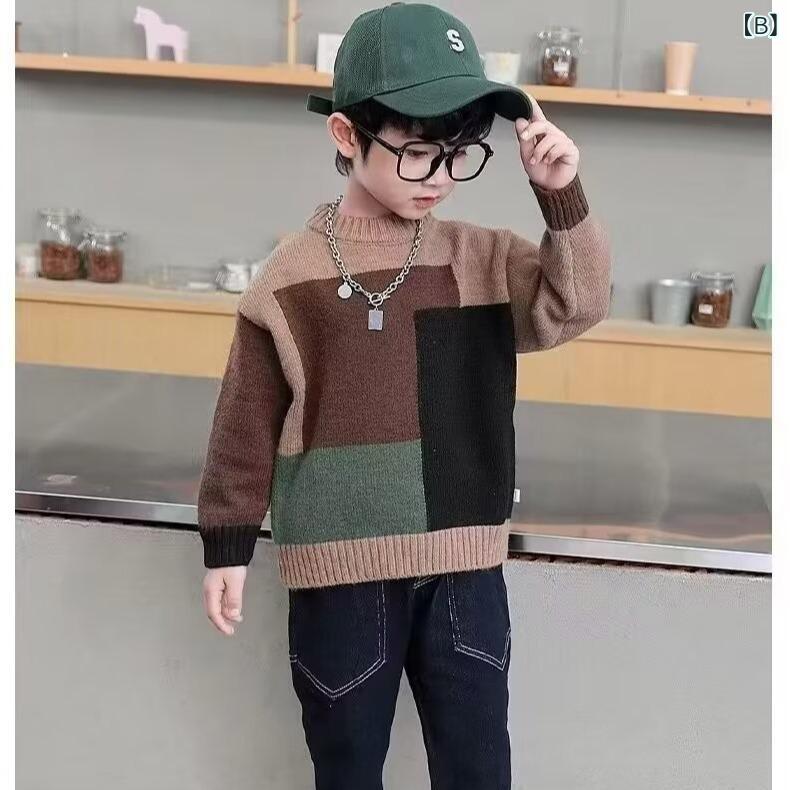子供服 ニット トップス 男の子 秋冬 厚手 プルオーバー 長袖 セーター スポーツ 配色 110 120 130 140 150 160 170 ブラック カーキ
