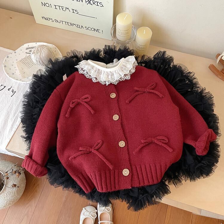 子供服 ニットカーディガン 女の子 秋冬 森ガール レトロ調 蝶結び かわいい 韓国風 セーター 長袖 カーディガン 赤 黒 チュールスカート セット 普段着
