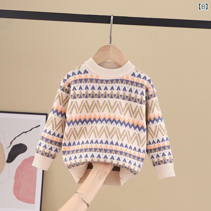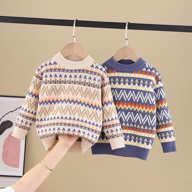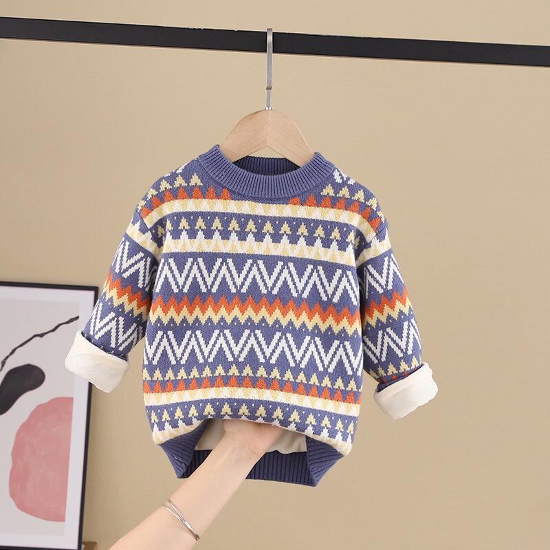 ニット 子供服 男の子 長袖 丸首 厚手 裏起毛 ジャガード 暖かい 秋冬 防寒 普段着 おしゃれ 深藍色 米色