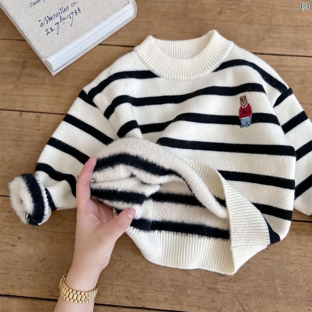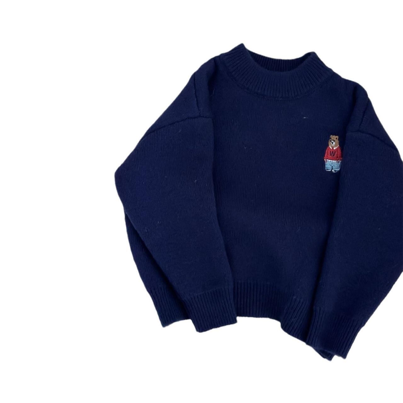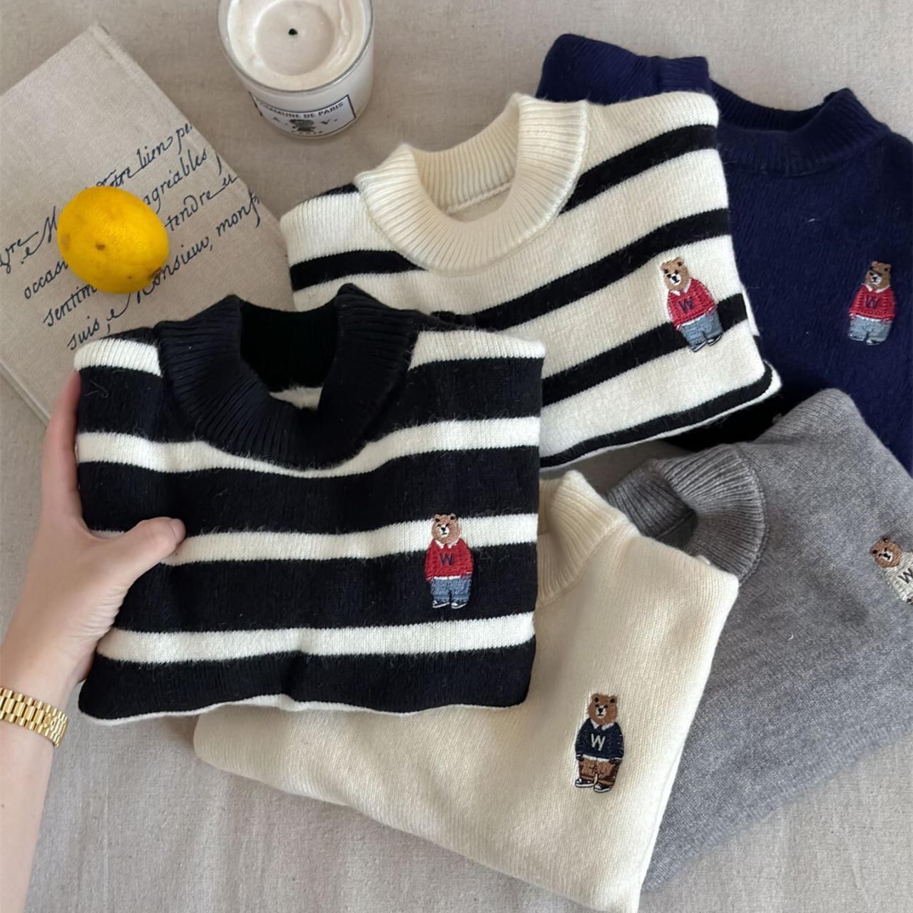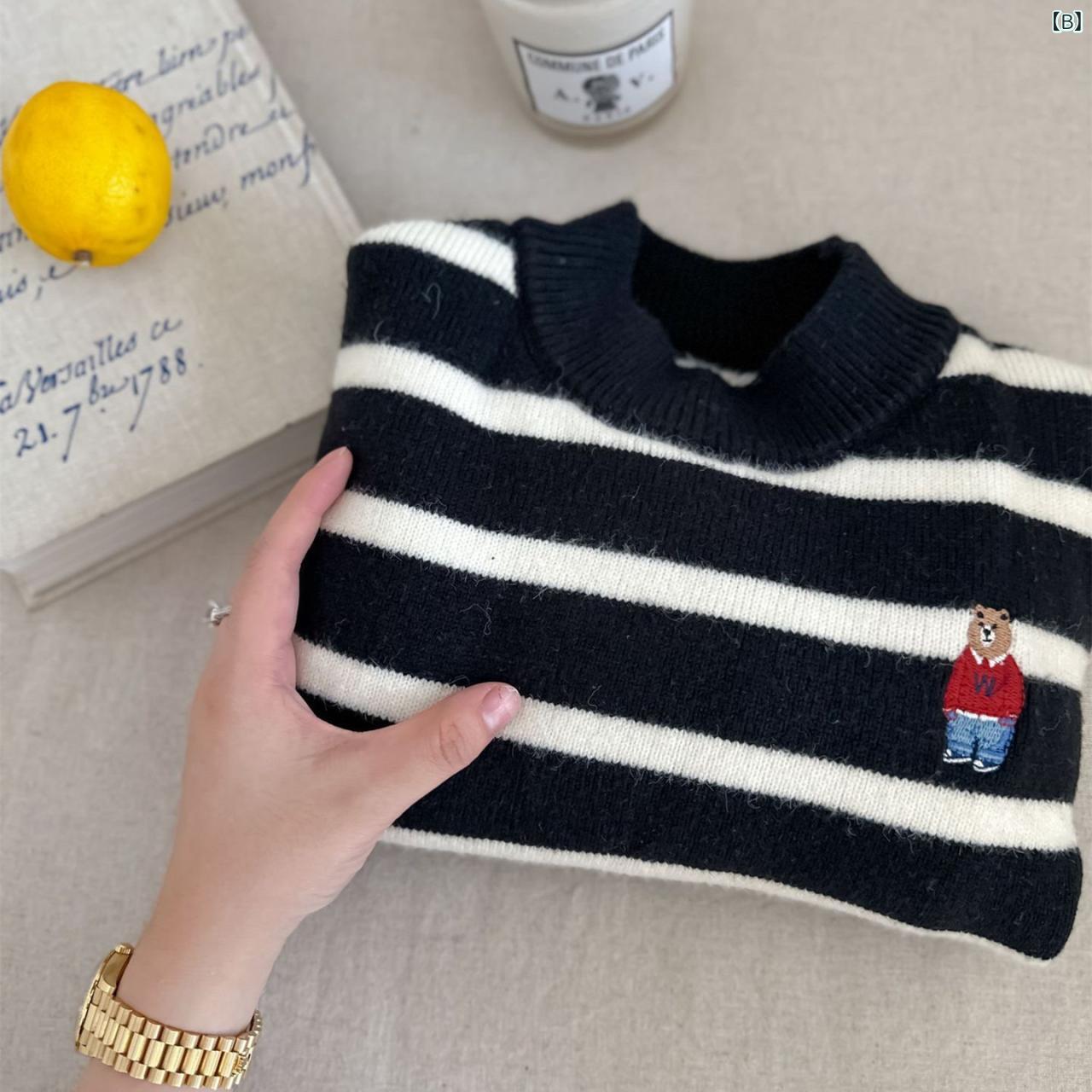 ニット キッズ 子供用 秋冬 男の子 女の子 ボーダー クマ 刺繍 ハイネック セーター 厚手 綿 90 100 110 120 130 140