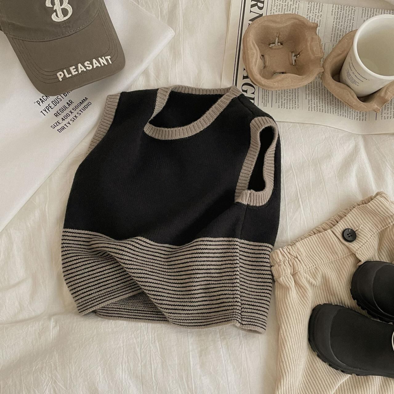 子供服 ニットベスト ストライプ 切り替え 春秋物 男女兼用 3歳 4歳 5歳 6歳 7歳 8歳 普段使い 韓国風 柔らかい