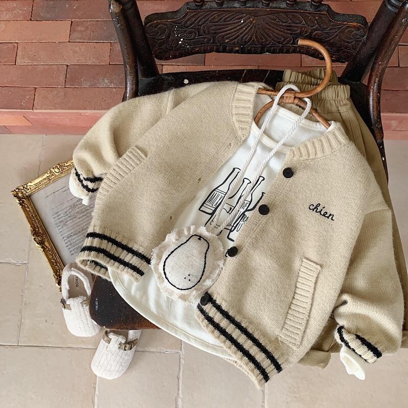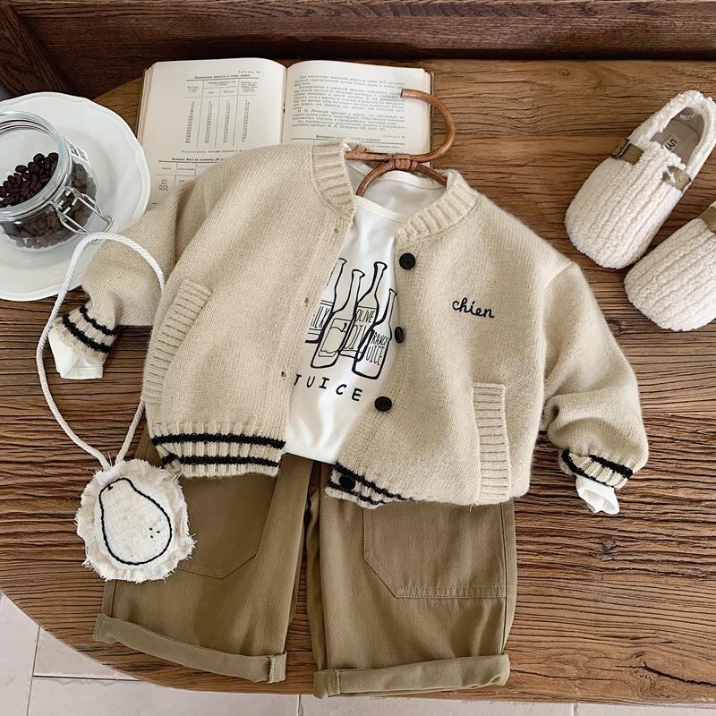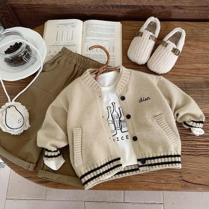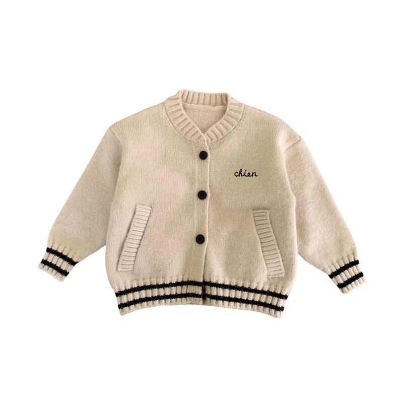 ニット キッズ 男の子 カーディガン 秋冬 子供服 セーター 長袖 トップス ミドル丈 アウター おしゃれ かわいい 刺繡 あったか 防寒 ベージュ系