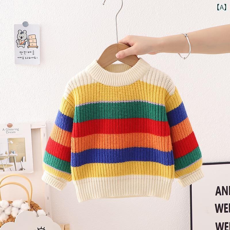 ニット・セーター キッズ 子供服 長袖トップス 秋冬物 ミドル丈 ストライプ柄 虹色 男の子 女の子 普段着 通園 通学着