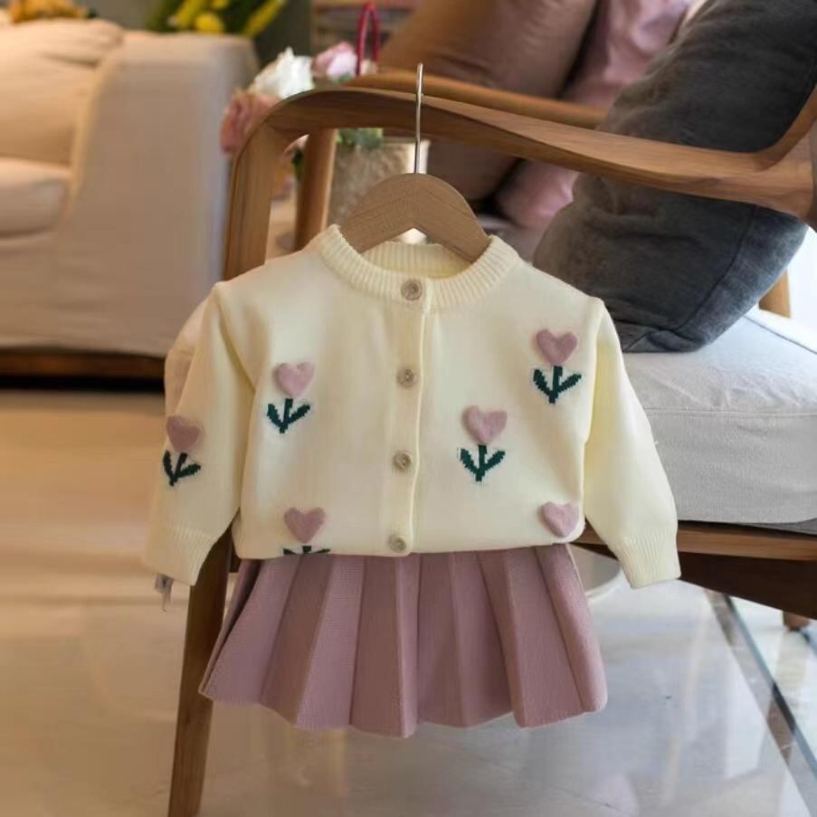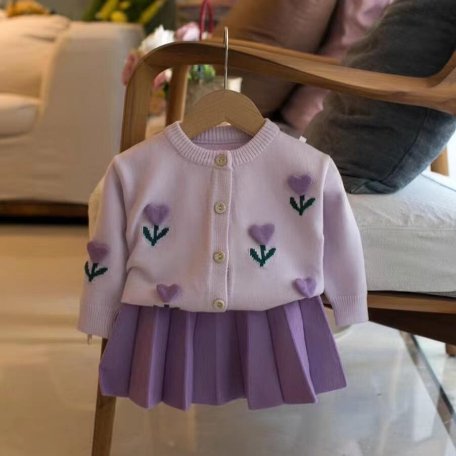 ニットセットアップ キッズ 女の子 ニットカーディガン & ニットスカート 2点セット 子供服 かわいい 花柄 襟フリル 長袖 秋冬 パープル ピンク系 ホワイト 90 100 110 120 130