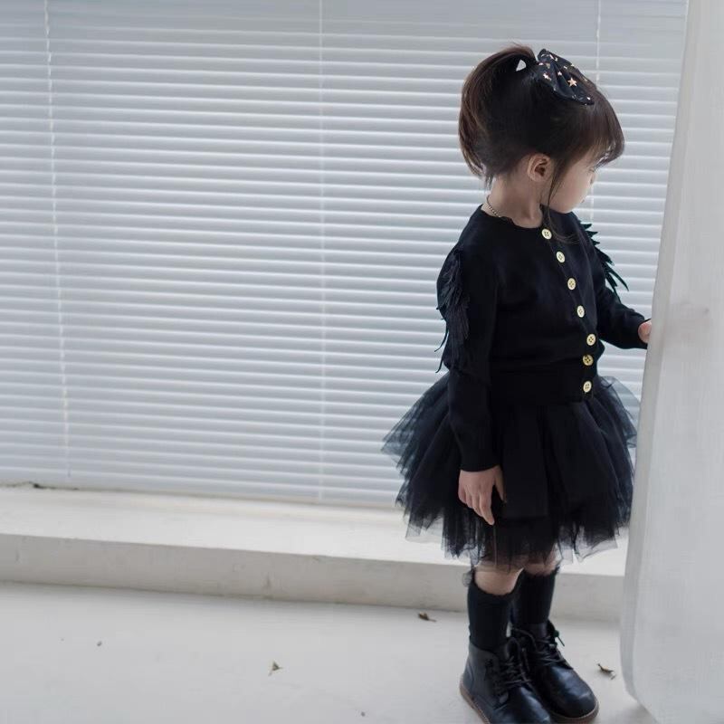ニットカーディガン 女の子 ベビー 子供服 春秋 長袖 綿 羽根付き 無地 黒 丸首 80cm 90cm 100cm 110cm 120cm 130cm