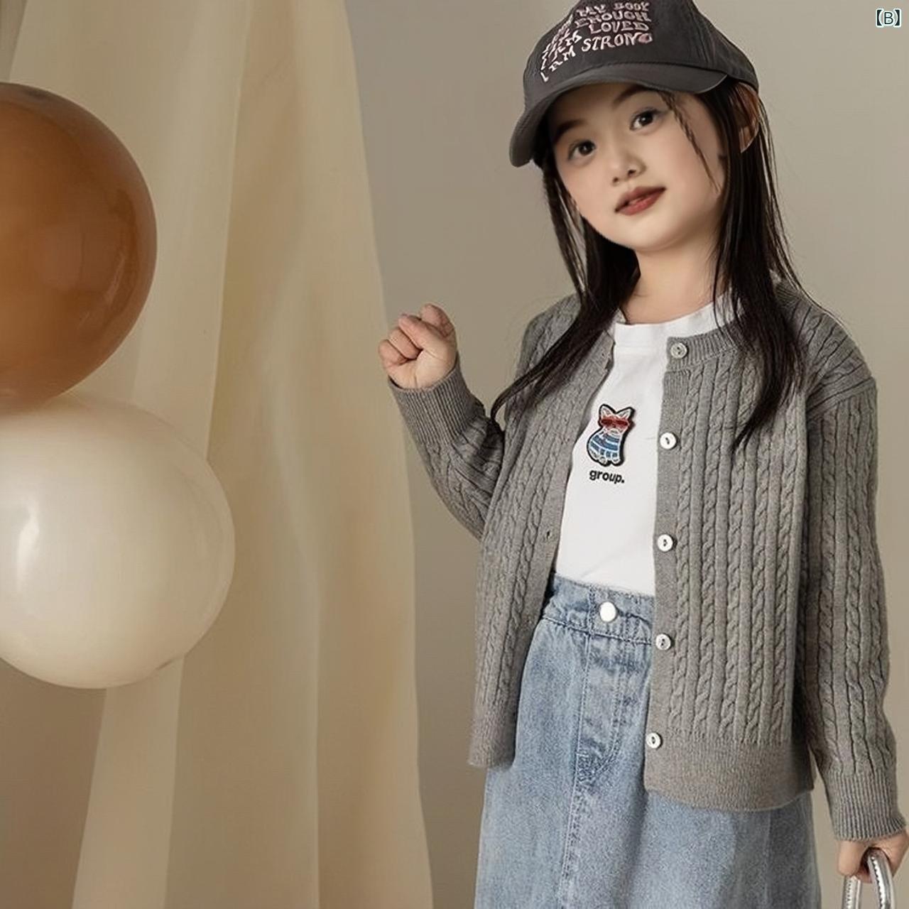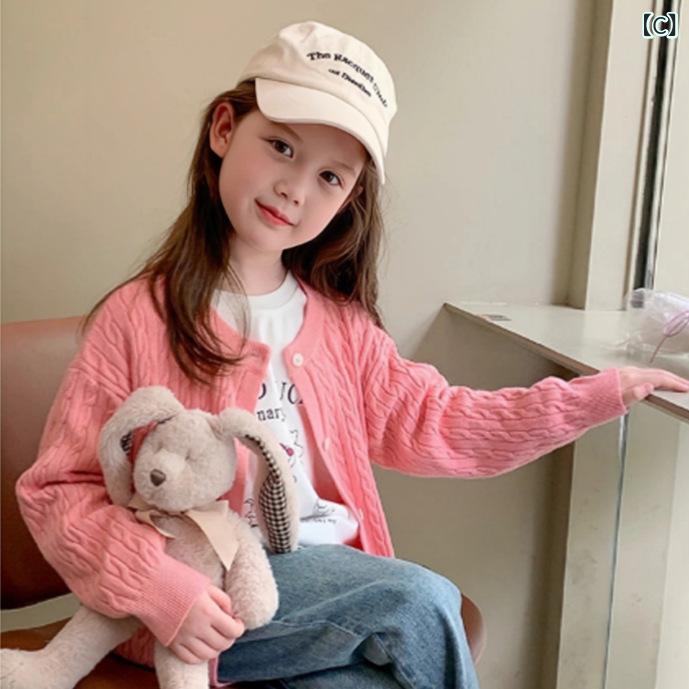 ニットカーディガン キッズ 女の子 子供服 秋冬 長袖 無地 ケーブル編み 丸首 羽織り かわいい おしゃれ 普段着 通園 通学 アイボリー ピンク系 グレー ブラック
