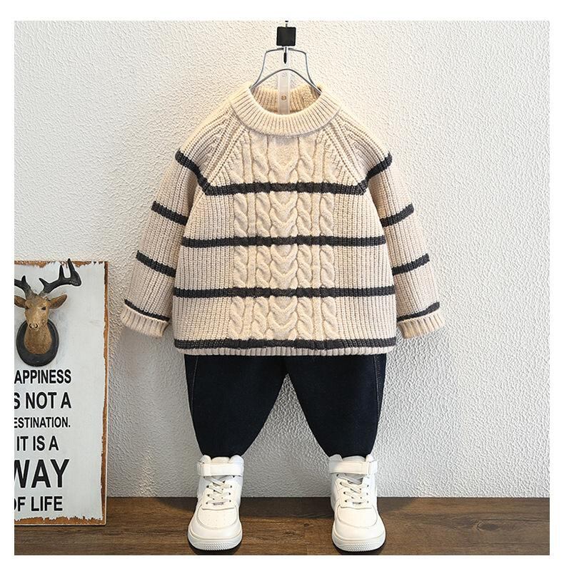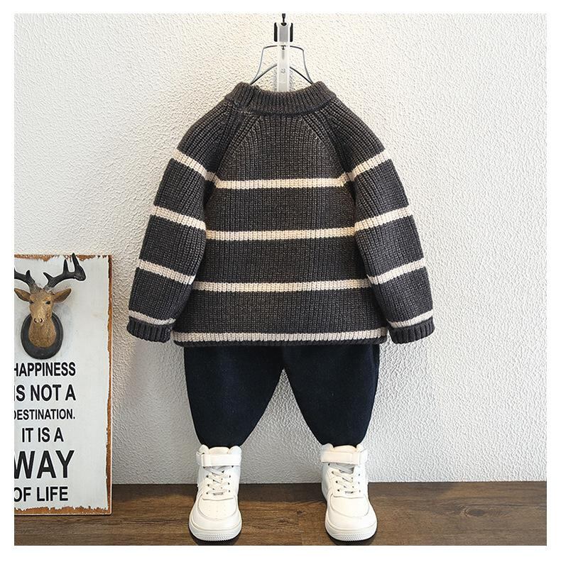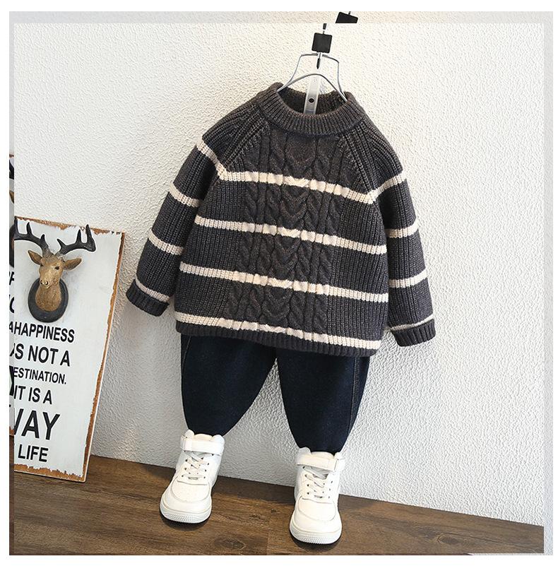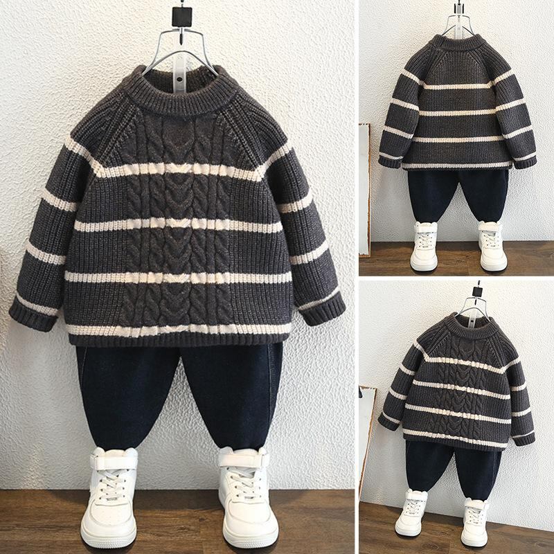 ニット・セーター キッズ ボーイズ 秋冬物 ストライプ柄 トップス 長袖 プルオーバー 丸首 コットン ミドル丈 厚手 普段使い 通園 通学 子供服 男の子 90 100 110 120 130 140 150cm