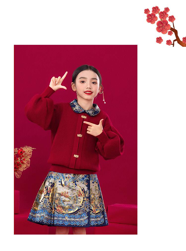 子供服 女の子 ニット トップス 馬面スカート セットアップ 中華風 大人も着れるサイズ レッド 綿 長袖 秋冬