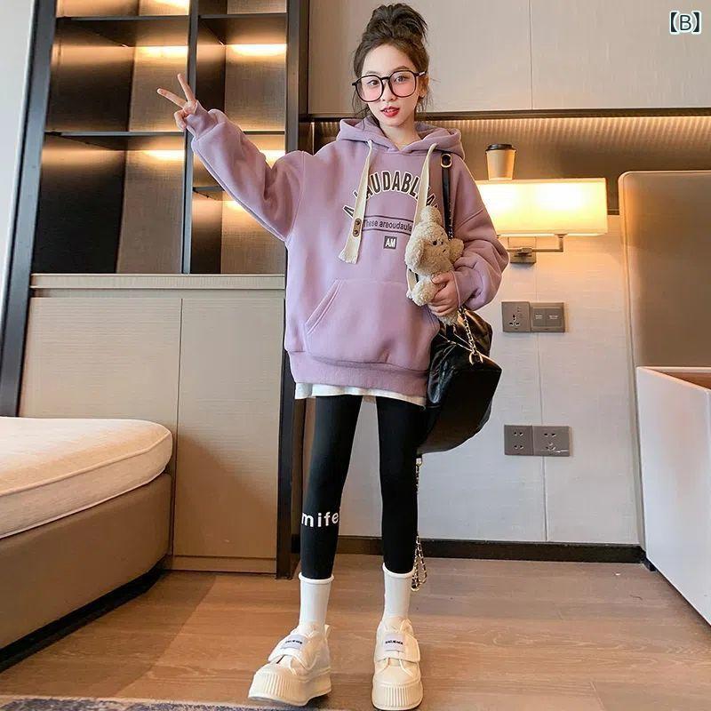 子供服 女の子 裏起毛 秋冬用 トレーナー フード付き トップス 8歳以上 中大童サイズ 140cm以上 杏色 紫色 普段使い