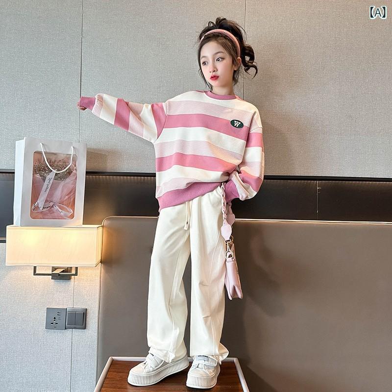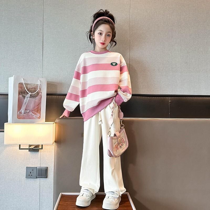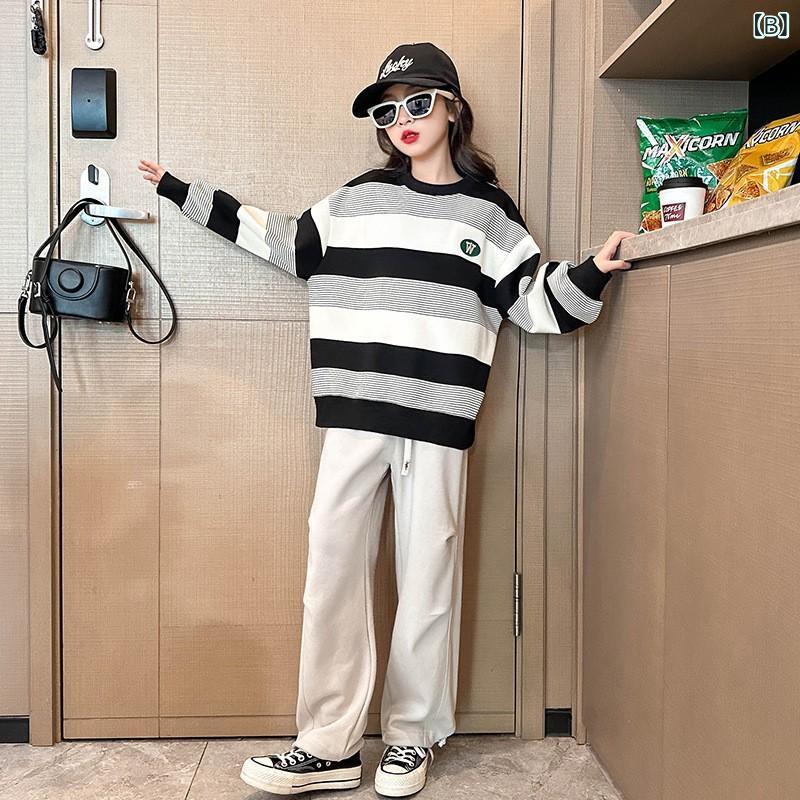 子供用スウェットシャツ 女の子 春秋 トップス 長袖 ストライプ柄 カジュアル 普段使い 部屋着 運動着 ポリエステル ピンク系 ブラック