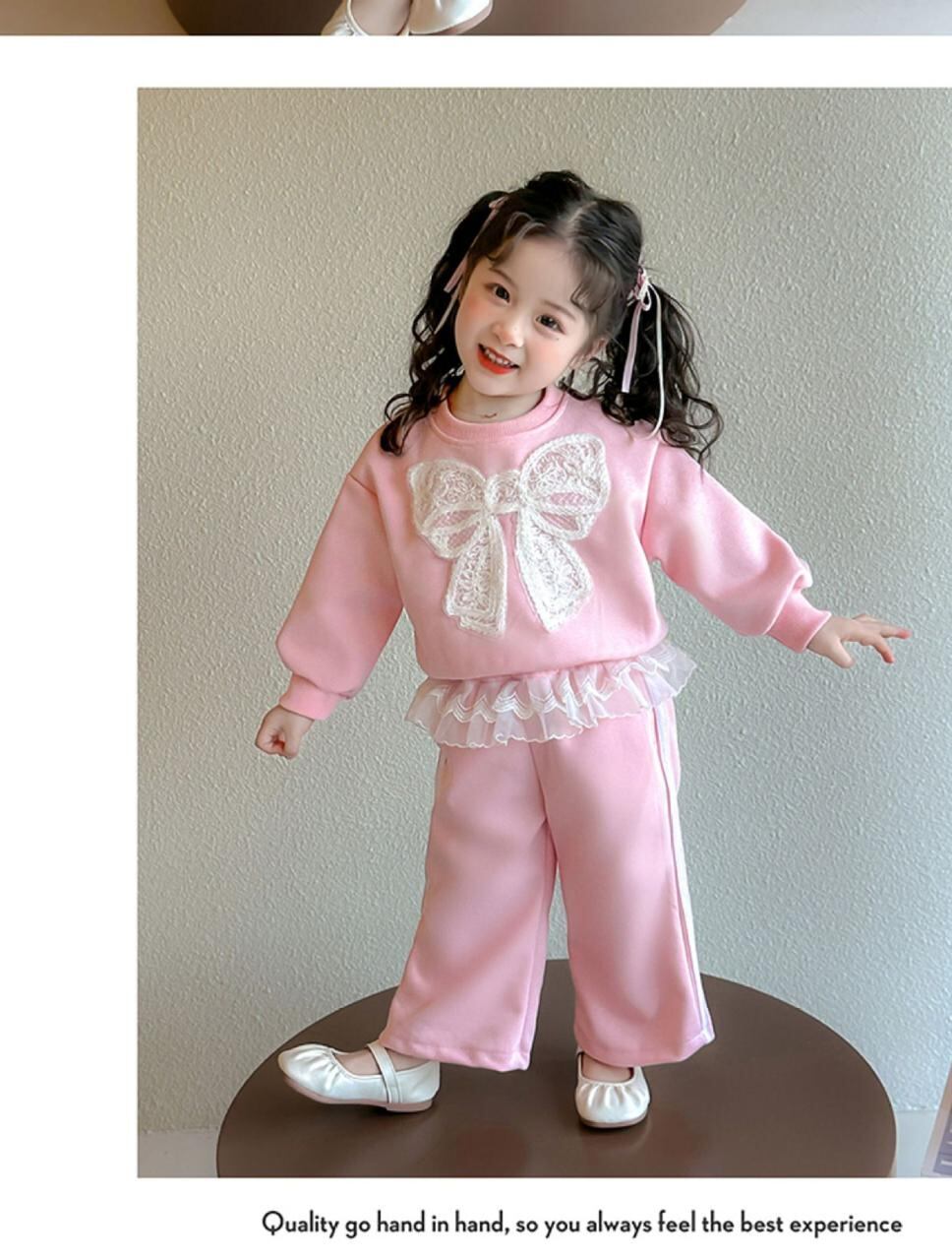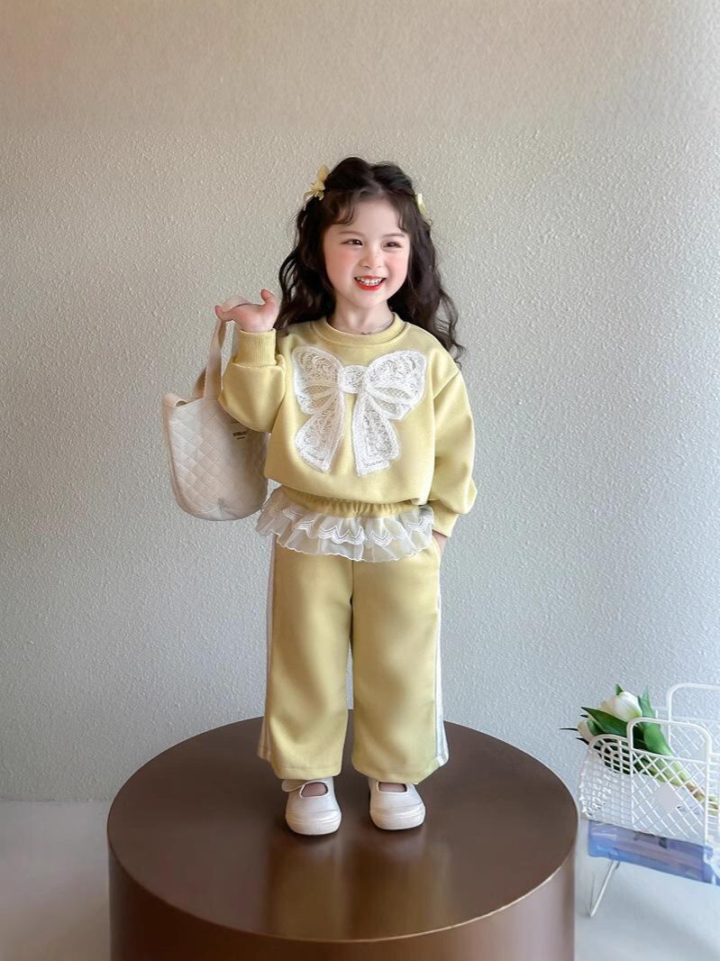 子供服 女の子 レース 蝶結び トレーナー 上下セット 春秋 幼児 小学生 ピンク イエロー かわいい 普段着