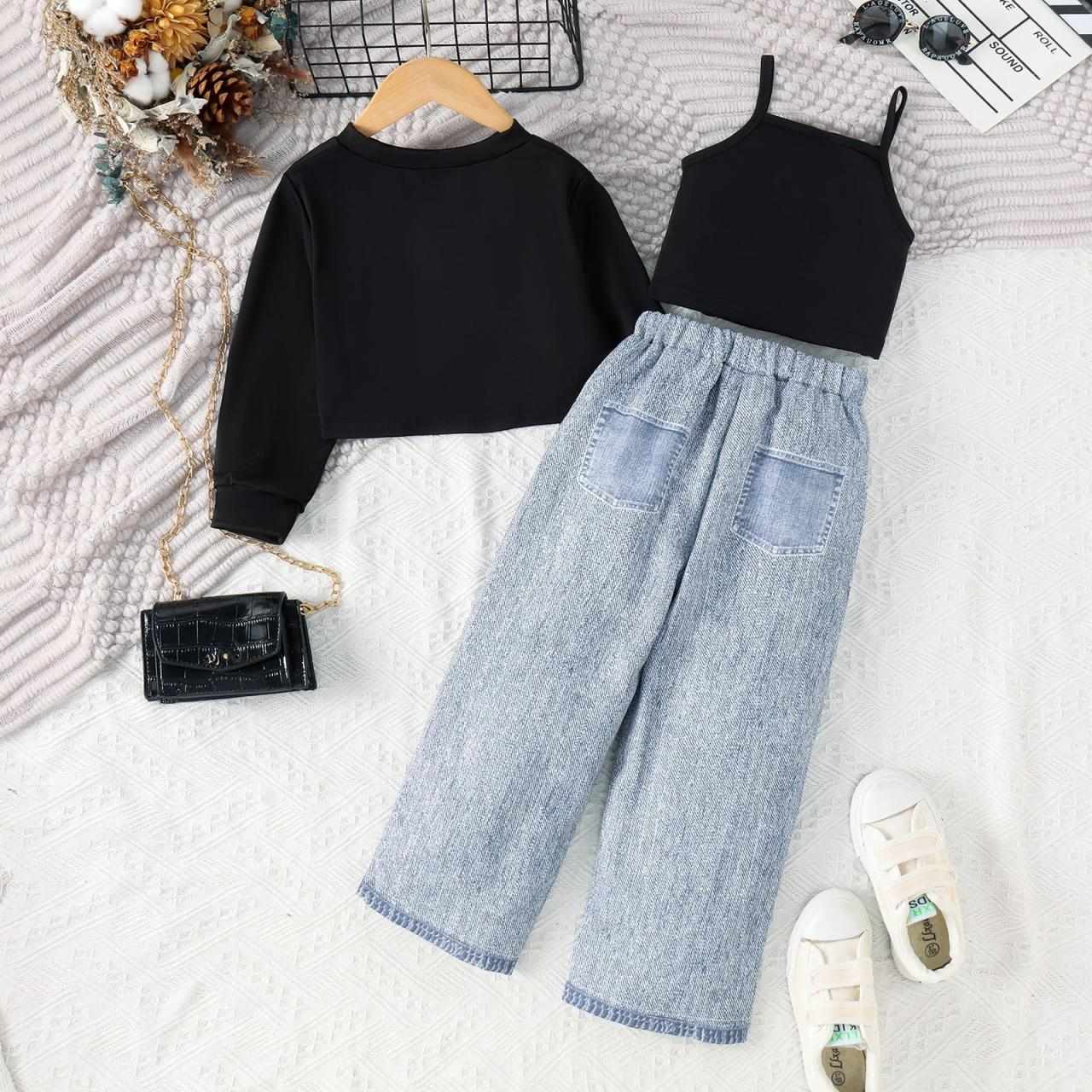 キッズ ガールズ スウェット セットアップ 長袖 トレーナー + キャミソール + レギンス パンツ 3点セット 綿 65% ブラック レッド 秋冬 普段使い