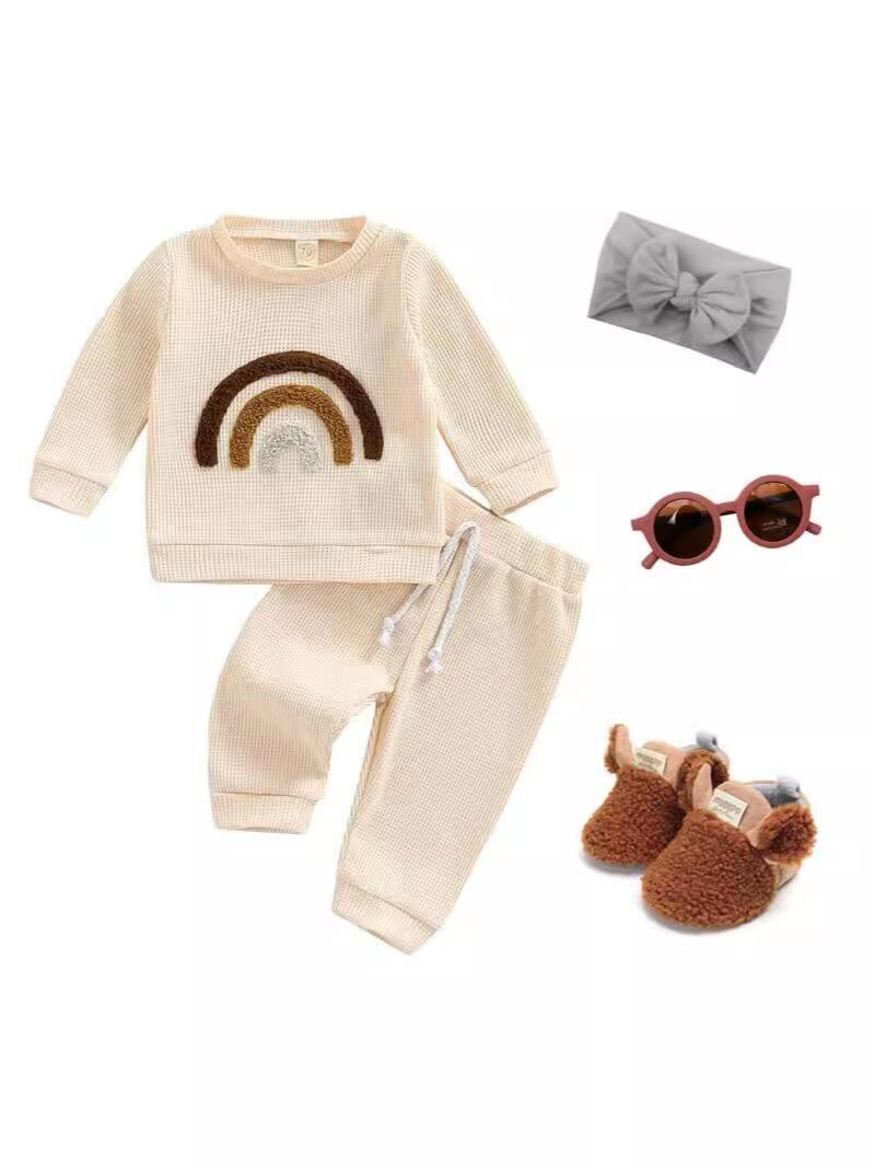 ベビー服 赤ちゃん ニットワッフル スウェット セットアップ 乳幼児 男女兼用 長袖 トップス パンツ 上下セット かわいい 普段着 秋冬 綿混 ミルクホワイト ストーングレー
