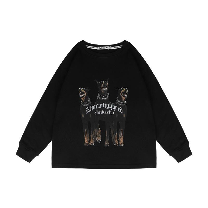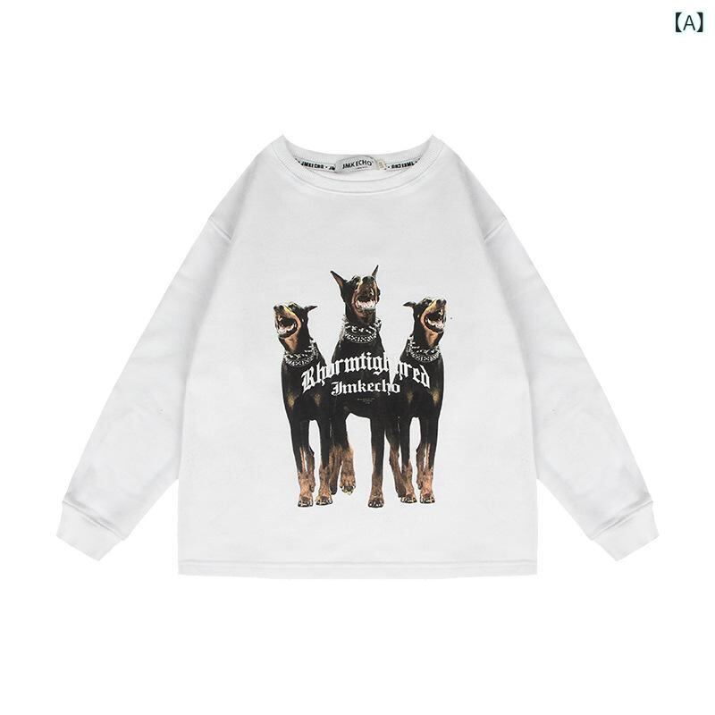 子供用トレーナー 男女兼用 ストリート風 犬プリント クルーネック トップス 中大童向け コットン100% 春秋 白 黒