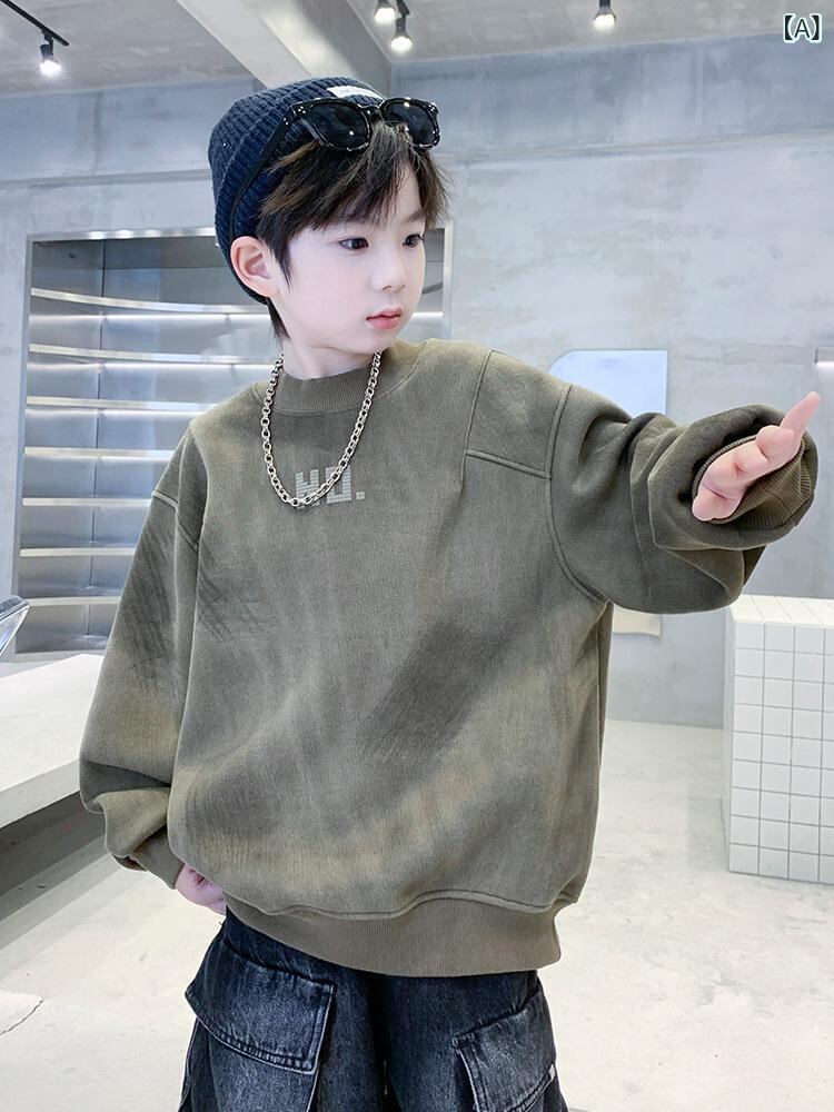 子供服 トレーナー 男の子 裏起毛 トップス 秋冬 厚手 防寒 普段着 部屋着 アウトドア 8歳以上 140cm以上 コットン 混紡 軍綠色 灰杏色