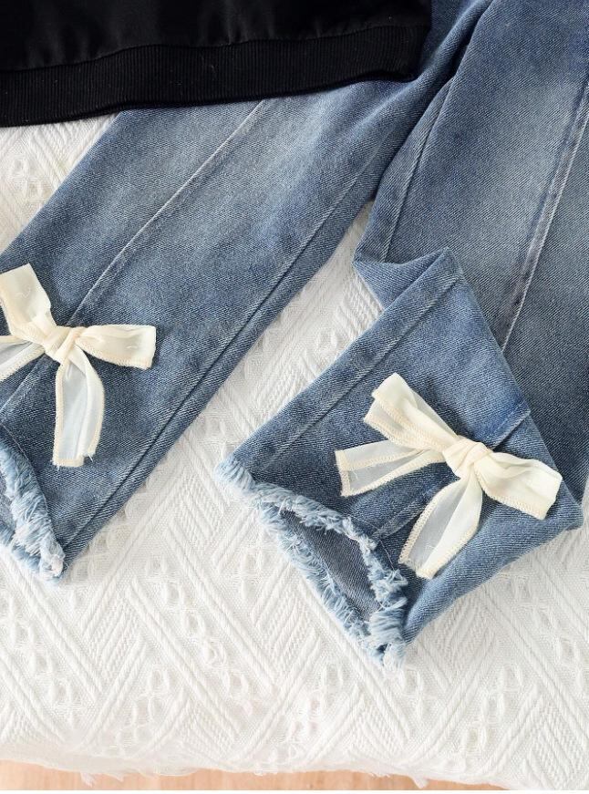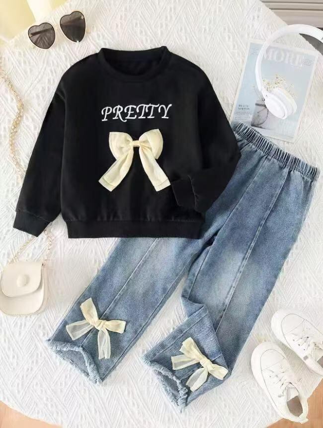 子供服 女の子 長袖Tシャツ & デニムパンツ 2点セット 秋冬 3歳 4歳 5歳 6歳 7歳 女児 トップス ボトムス セットアップ 綿 65% 普段着 遊び着