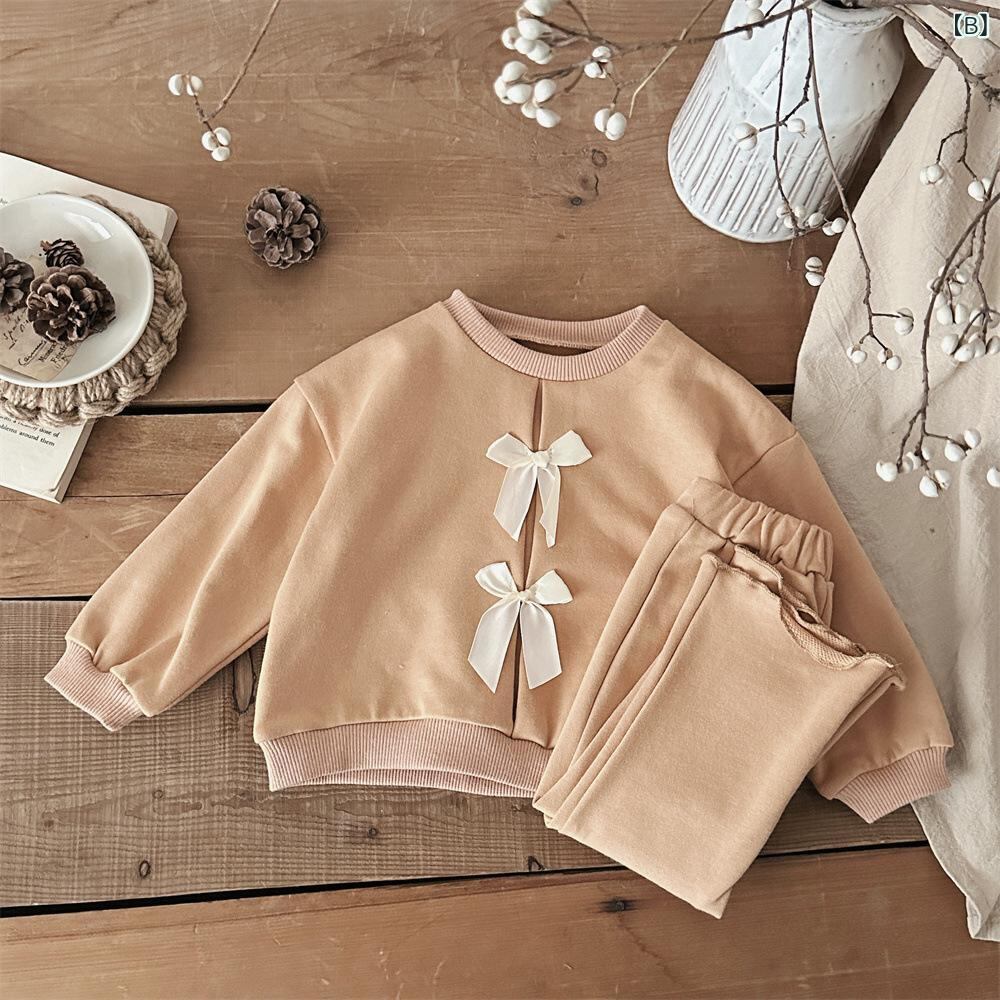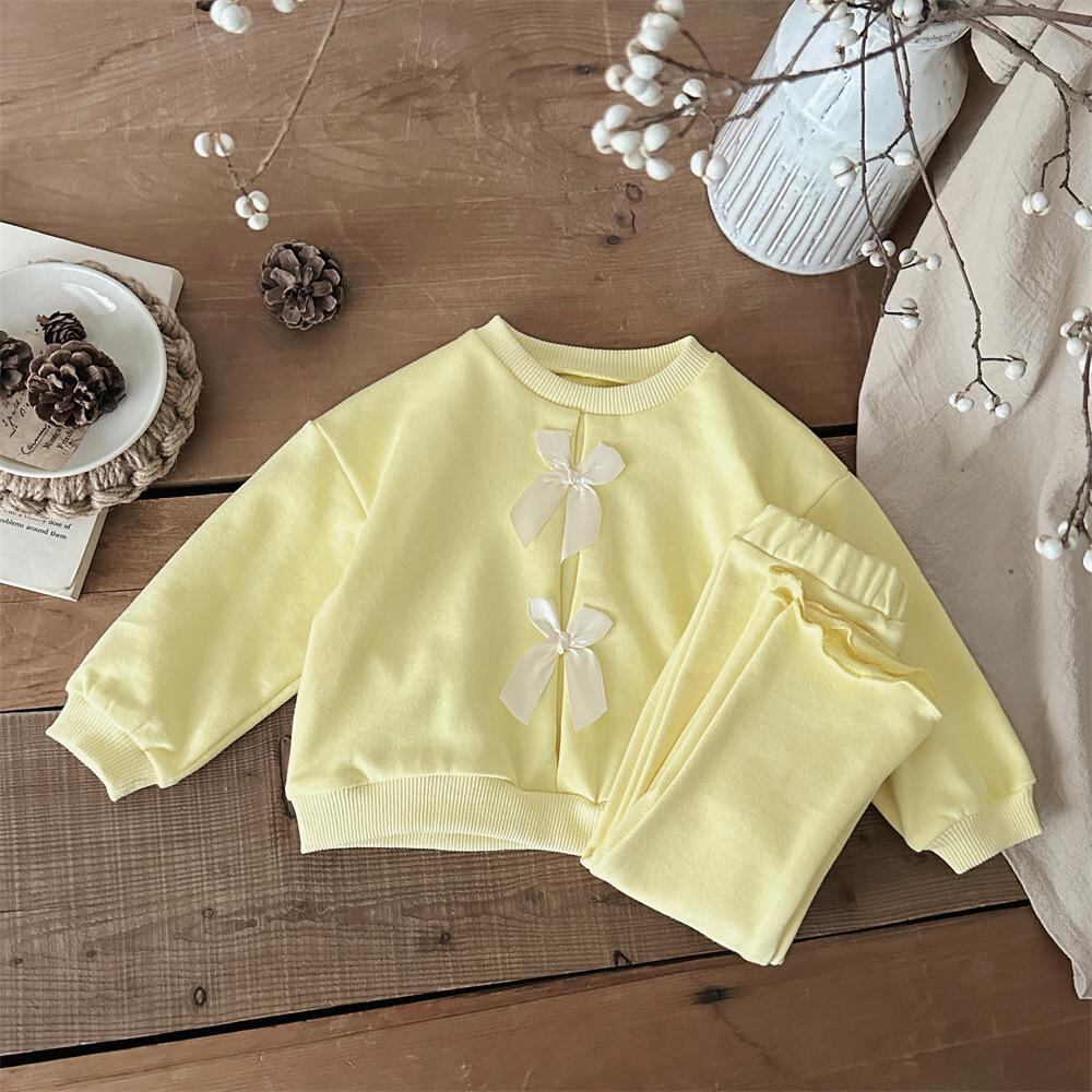 ベビー服 女の子 上下セット 長袖 トップス ズボン 春秋 幼児 2点セット かわいい 蝶結び 無地 韓国風 カットソー パンツ 普段着