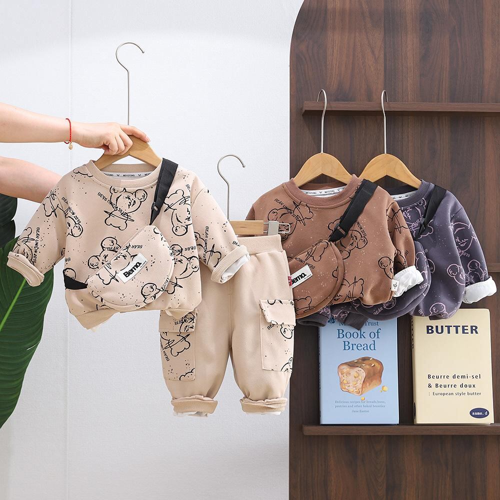 キッズ スウェット 上下セット 春秋 長袖 トップス パンツ かわいい 小熊 ベア プリント 韓国風 子供服 男の子 女の子 幼児 普段着 部屋着
