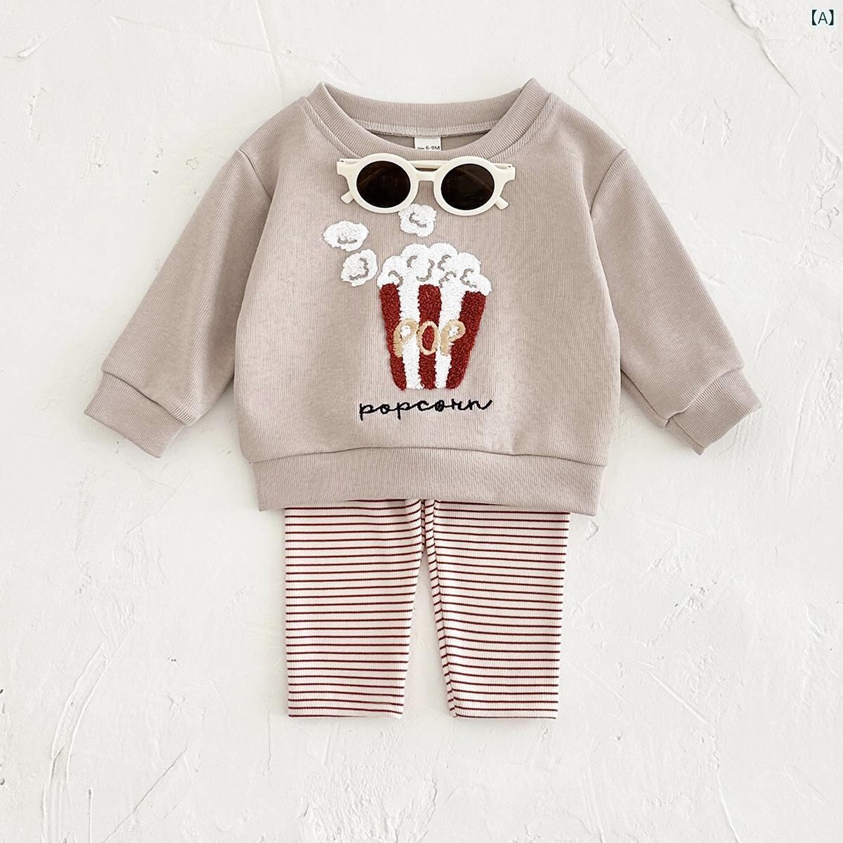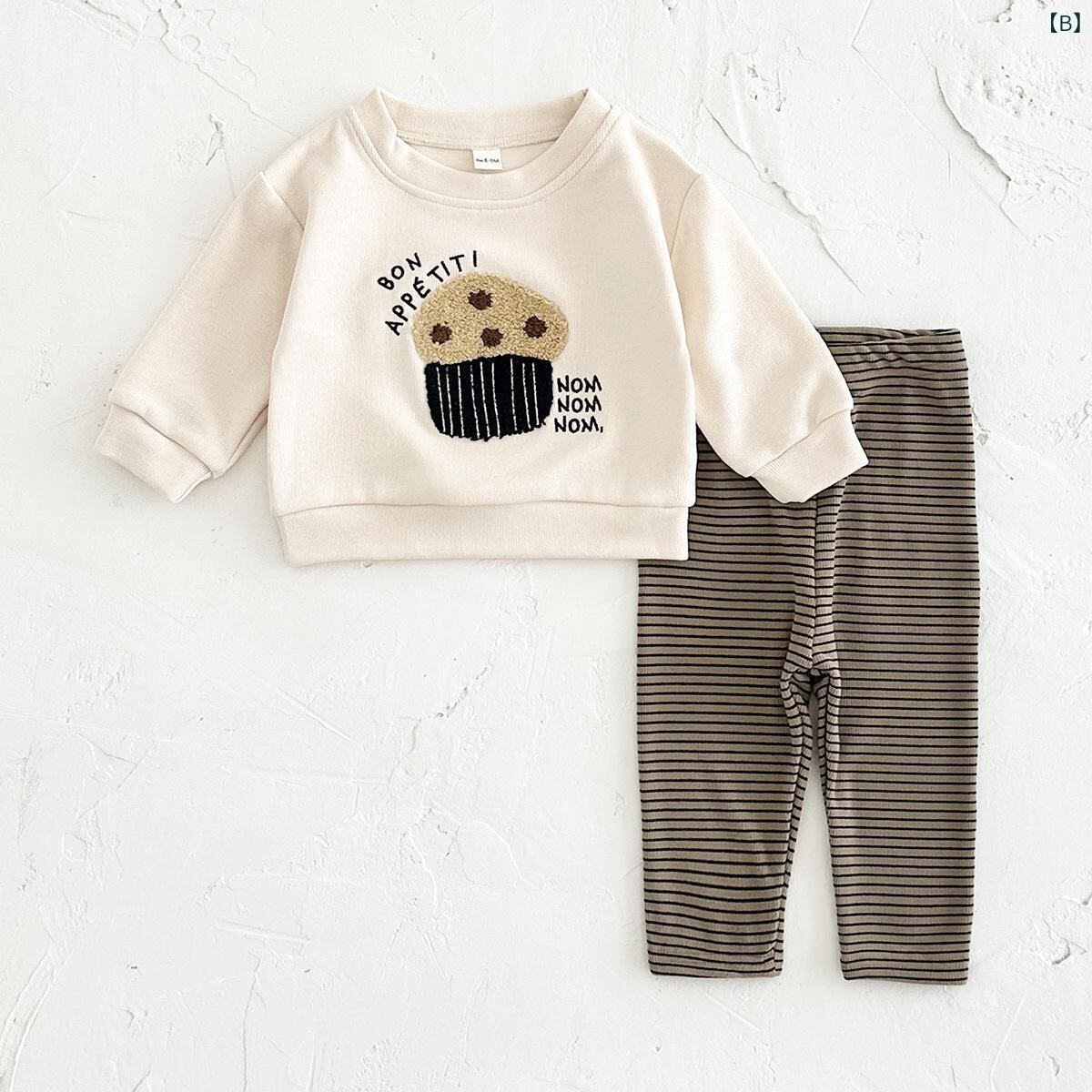 ベビー服 春秋 長袖 トップス パンツ 上下 2点 セット 乳幼児 女の子 男の子 かわいい 刺繍 ボーダー 普段使い 部屋着