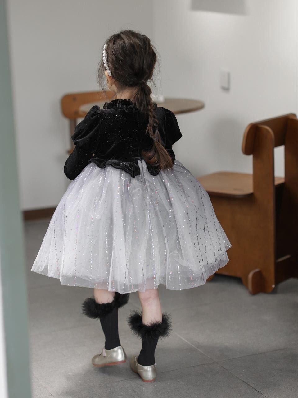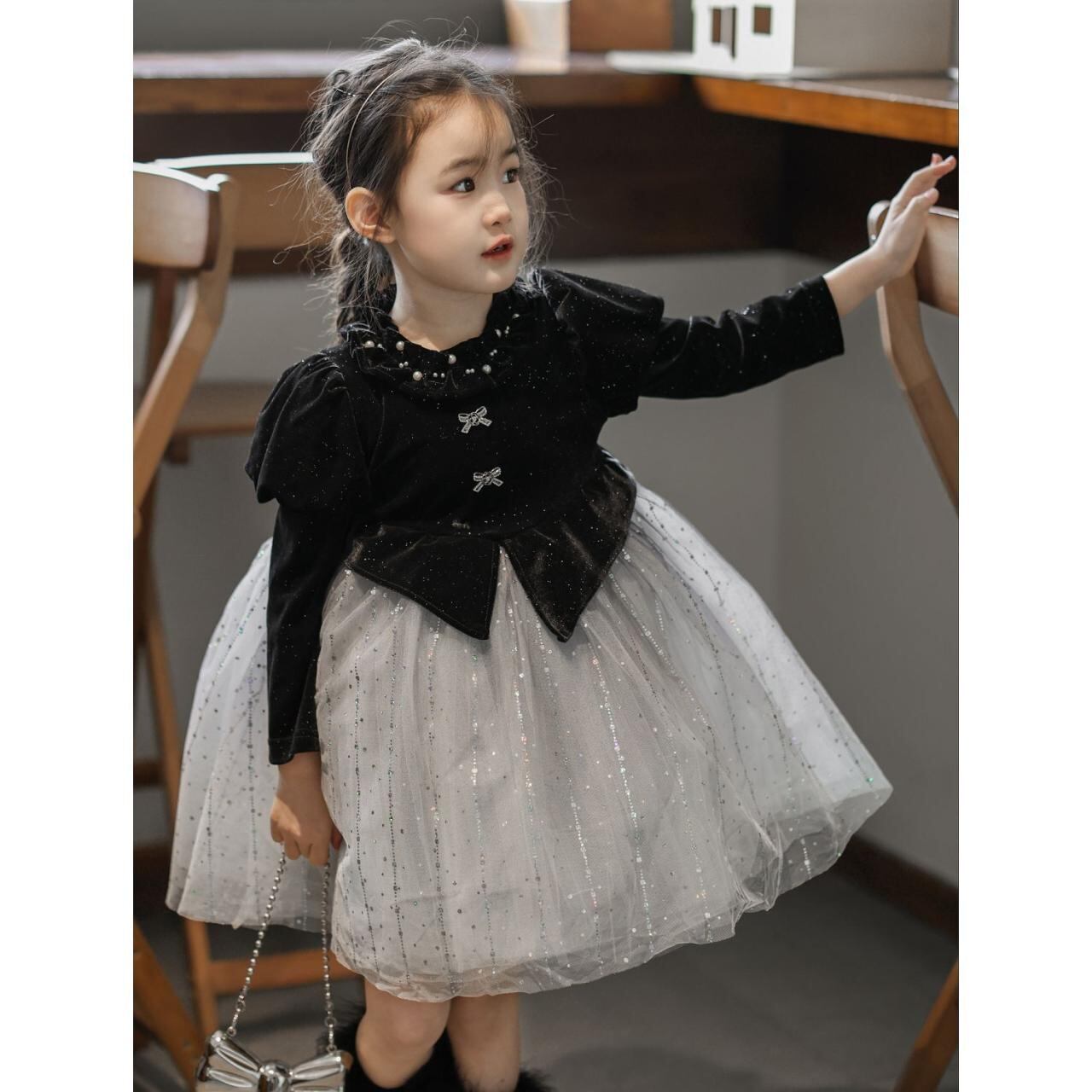 ワンピース キッズ 女の子 チュールスカート ベルベット Aライン プリンセス 黒 ブラック スパンコール 発表会 パーティー ドット 水玉 かわいい 秋冬