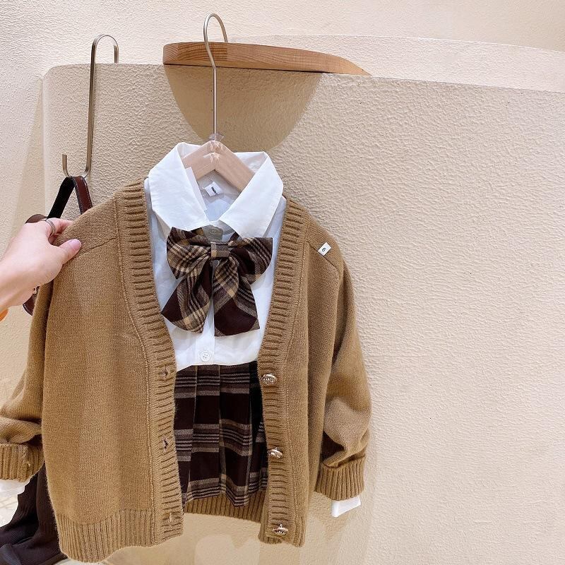 子供服 女の子 JK制服 セットアップ フォーマル スーツ 春秋 長袖 シャツ ニット カーディガン プリーツスカート 3点セット 通園 通学 発表会 演奏会 ブラウン系