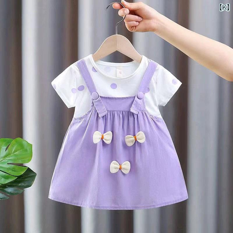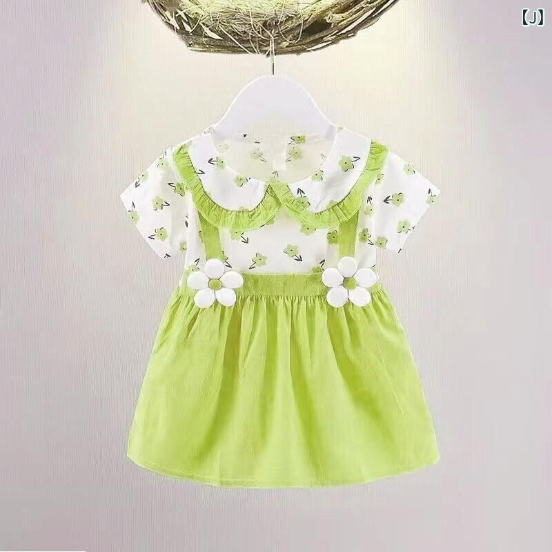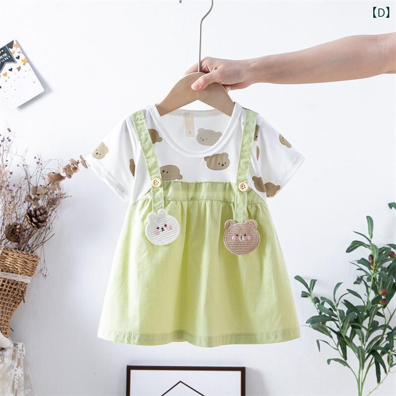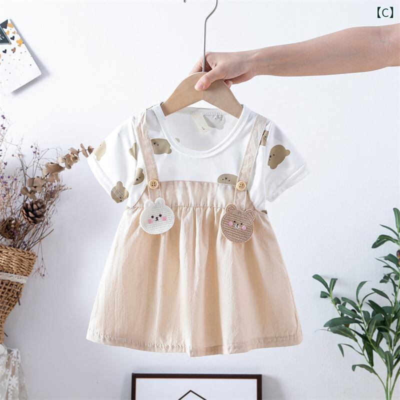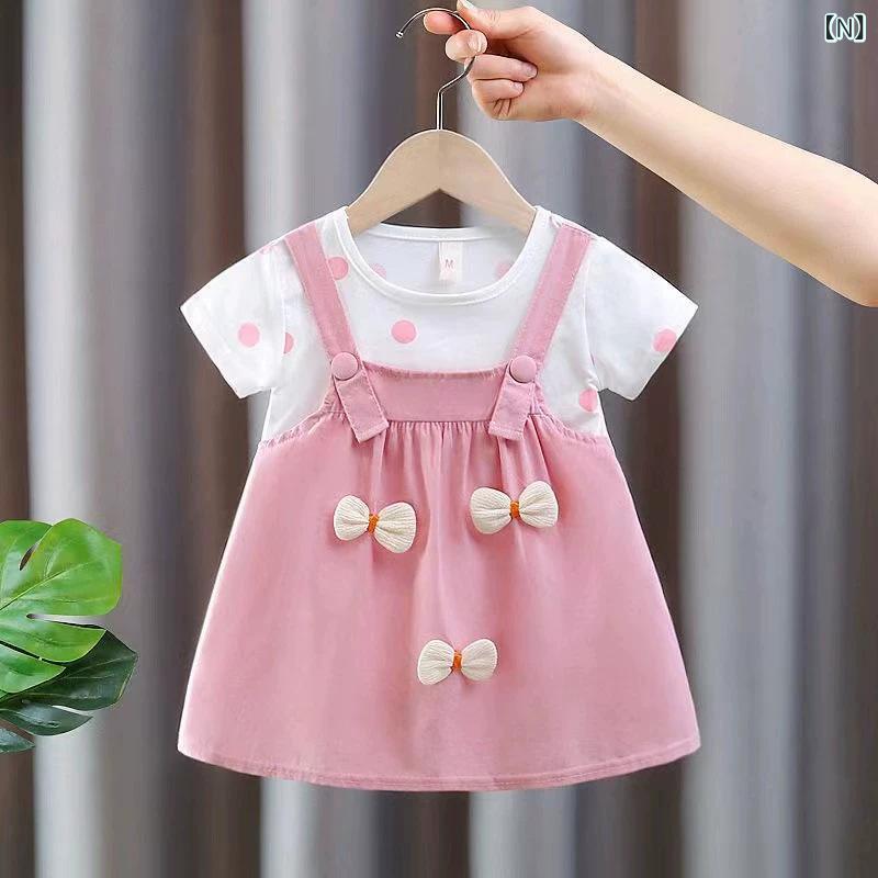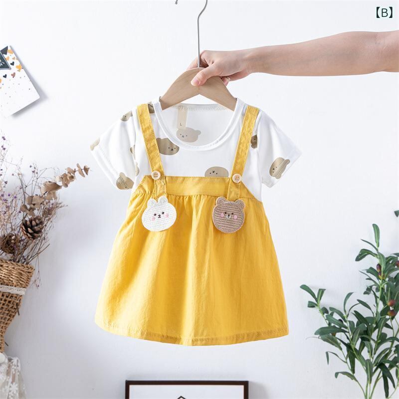 ワンピース ベビー・キッズ 女の子 半袖 Aライン プリンセススカート コットン 花柄 小熊柄 80 90 100 110cm 幼児 普段着 かわいい パステルカラー ピンク 黄色 緑