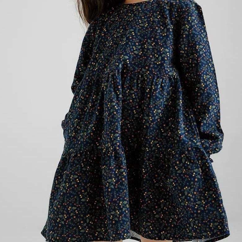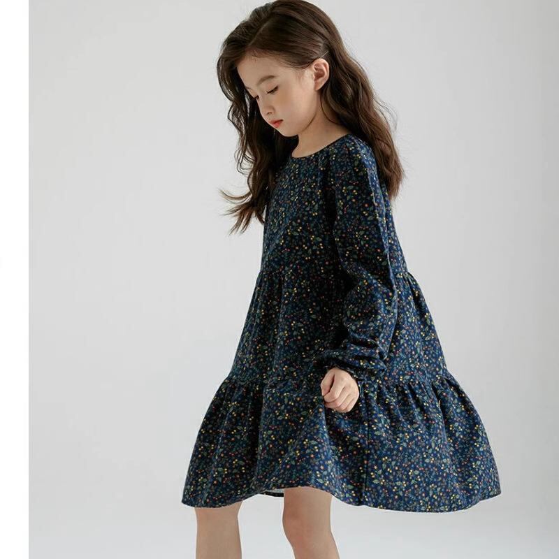 ワンピース キッズ 女の子 長袖 花柄 Aライン 膝丈 子供服 チュニック 春秋 冬 綿100% 紺色 110 120 130 140 150 160 170