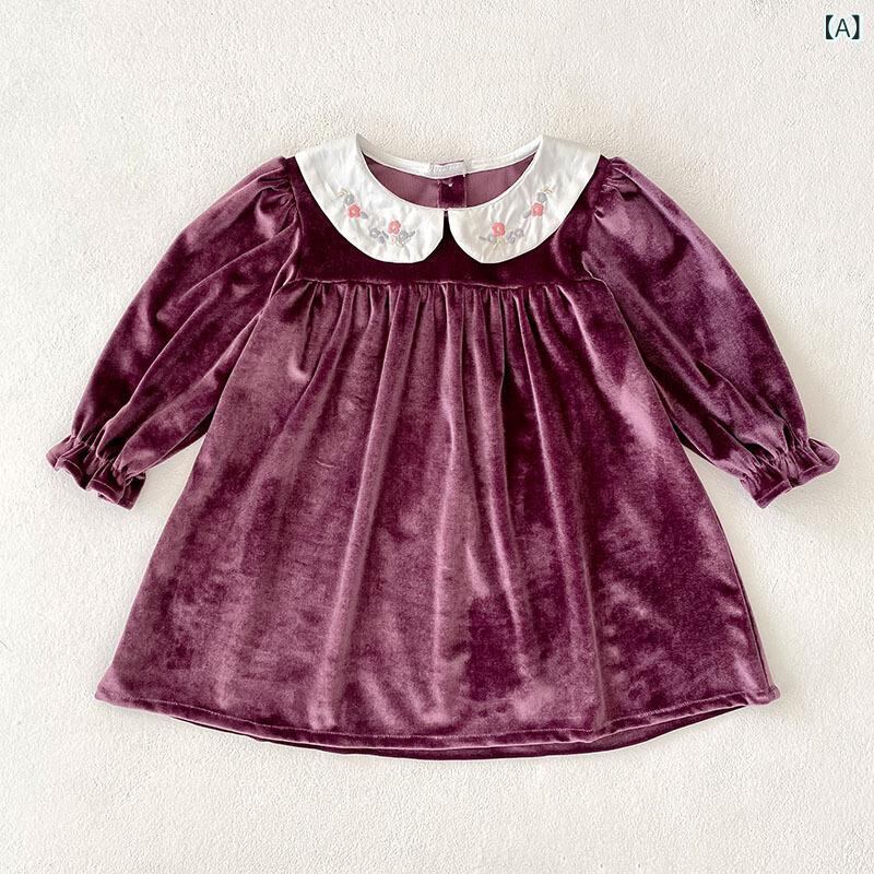 ワンピース キッズ 女の子 ベルベット 刺繡 長袖 プリンセス Aライン パープル 褐色 春秋 発表会 結婚式 パーティー