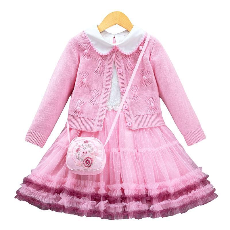 ワンピース 女の子 子供 ニット 2点セット セットアップ プリンセス チュールスカート チュチュスカート かわいい おしゃれ ガーリー 長袖 春秋 冬 普段着 お出かけ着 ピンク 紫 赤