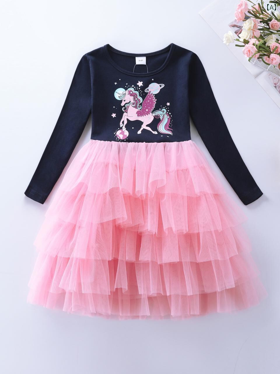 ワンピース 子供服 長袖 コットン カートーン プリント ユニコーン パーティー プリンセス ケーキスカート チュールスカート 膝丈 ミドル丈 春秋 春秋冬 発表会 結婚式 普段使い かわいい 紺色 ネイビー ピンク系