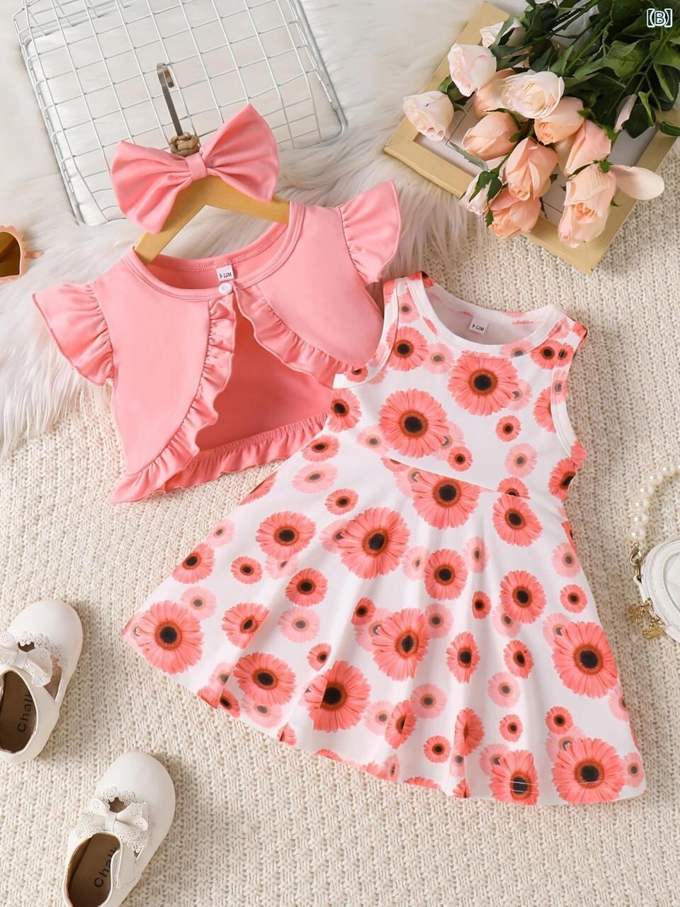 ワンピース ベビー 女の子 ノースリーブワンピース 半袖カーディガン ヘアアクセサリー付き 幼児 普段使い ポリエステル Aラインスカート 春夏